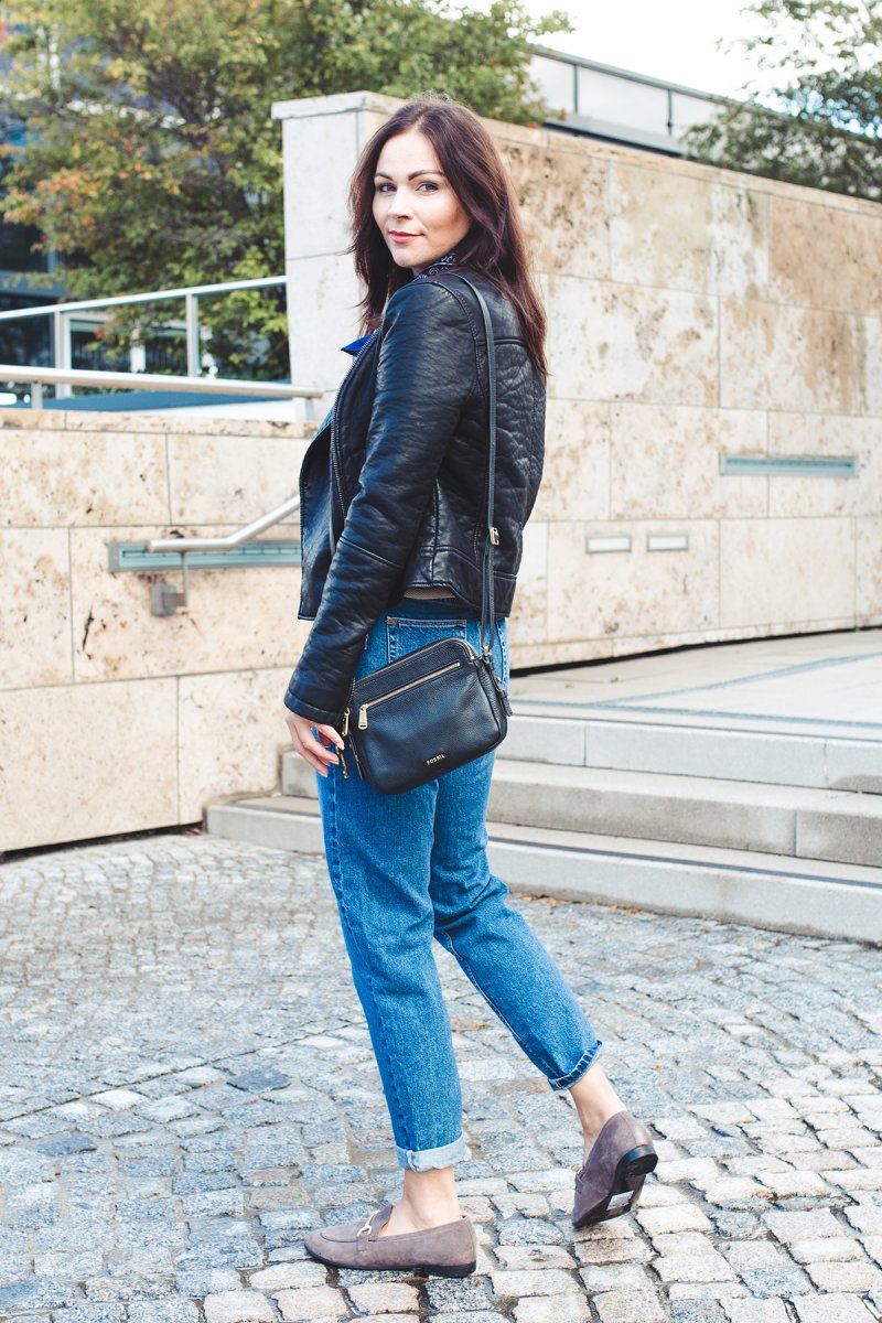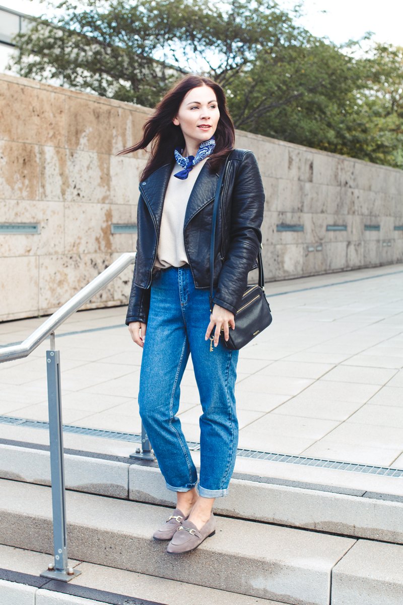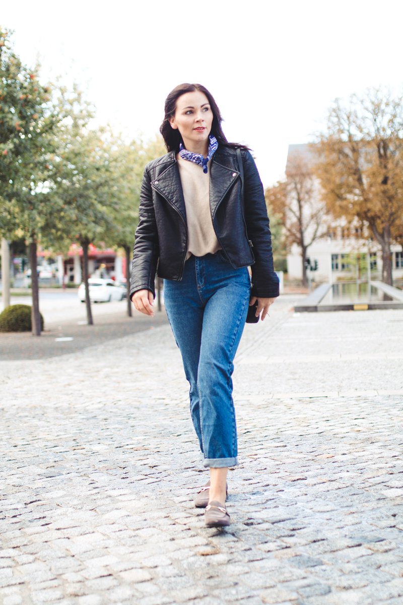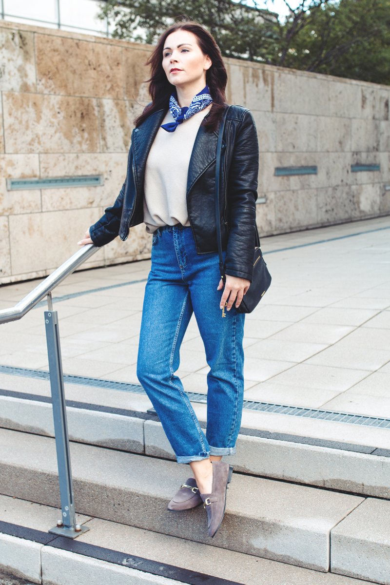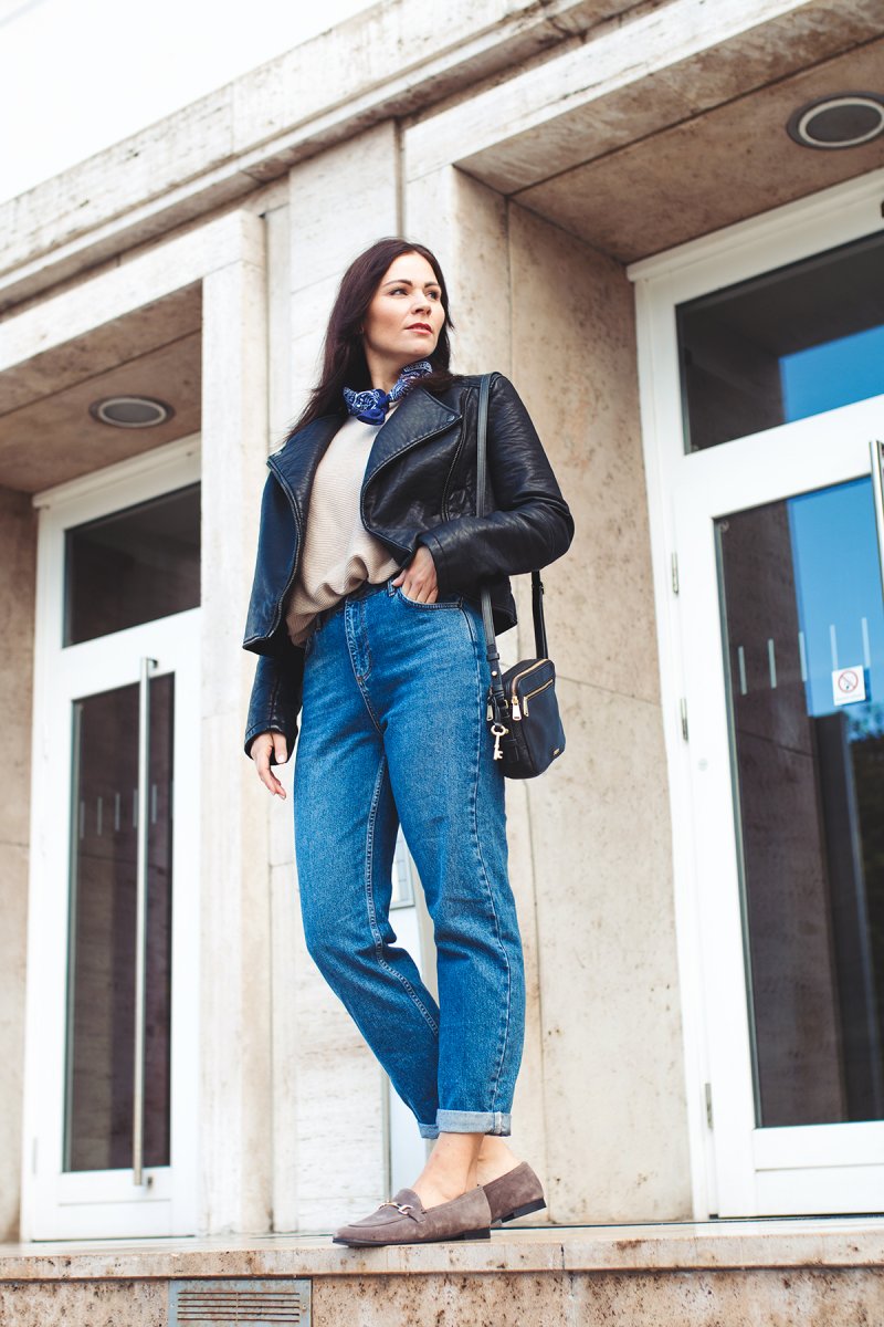 For my today’s outfit I combine a leather jacket with my new Topshop mom jeans and taupe slippers. The slippers are so comfy I love to wear it on my feet for my everyday walk. Furthermore, I combine the shoes to elegant outfit combinations, too. I think it matches perfectly with a black midi dress for a dinner in the evening but this look I show you here on my fashion blog at the next time.