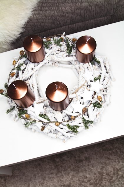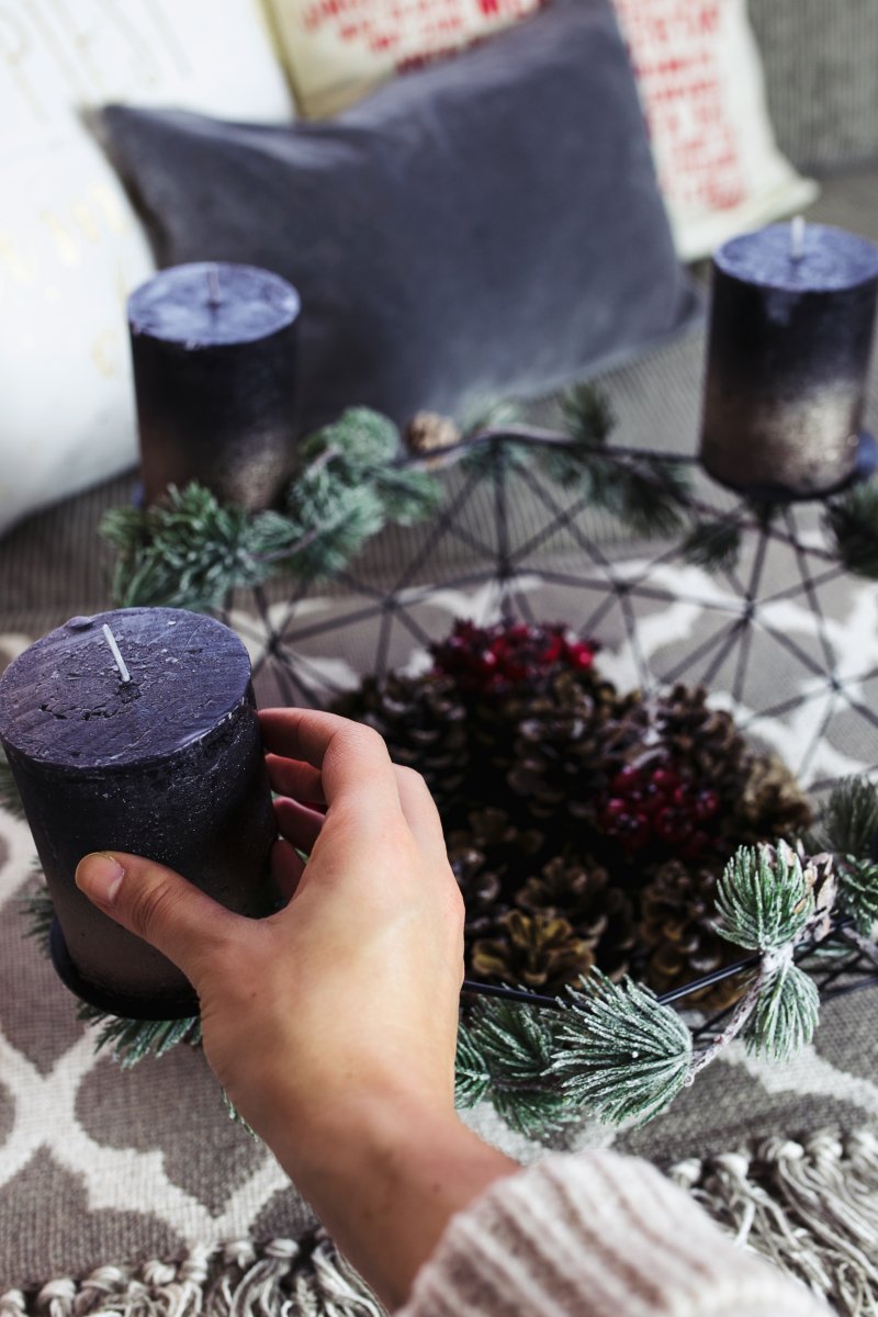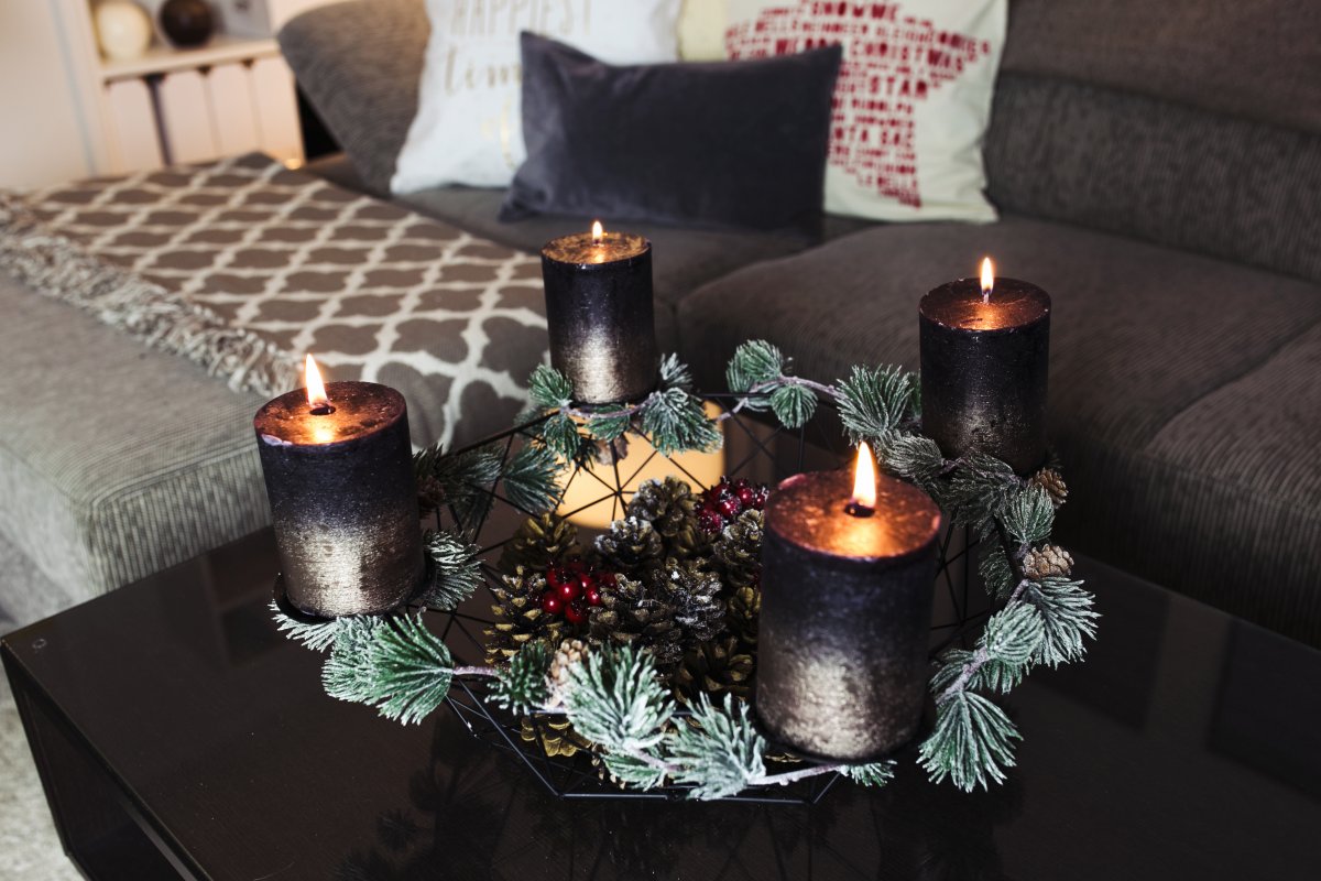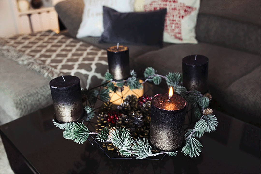 5. Stellt die Kerzen auf den Dekokerzenhalter und platziert ihn an dem richtigen Ort in der Wohnung. Ich habe meinen Adventskranz im Wohnzimmer auf den Wohnzimmertisch gestellt. Alternativ könnt ihr das Gesteck aber auch in der Küche auf den Küchentisch platzieren. Viel Spaß beim Dekorieren und Nachmachen!