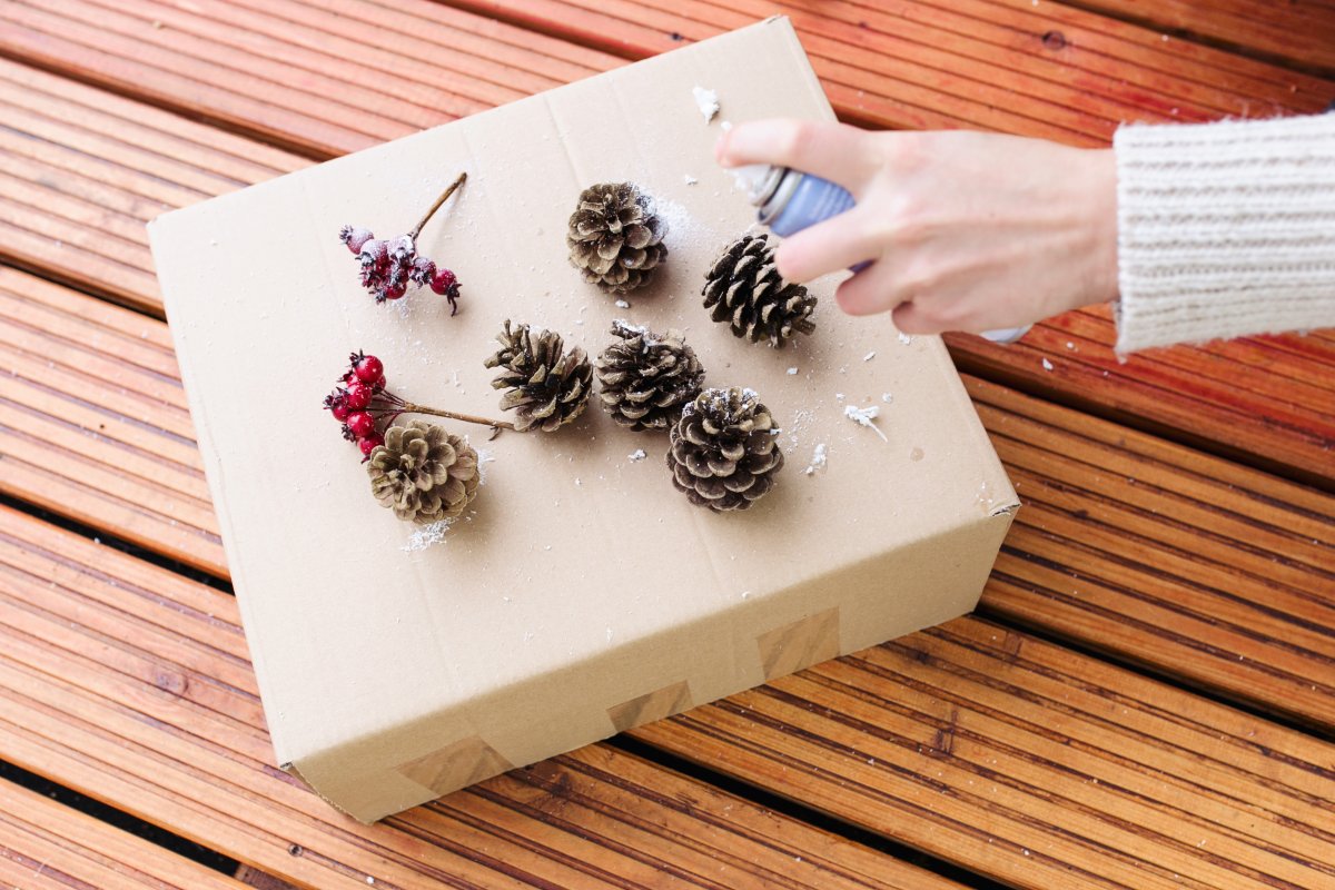 2. Besprüht die andere Hälfte der Tannenzapfen sowie einige Zweige mit Schneespray. Das ergibt ein interessantes Gesamtbild in eurer Dekoschale und es wirkt, als hätte es gerade geschneit. Kleiner Tipp: Besprüht die Zapfen am besten im Freien, das erleichtert euch das Arbeiten und ihr erspart euch das Putzen danach.
