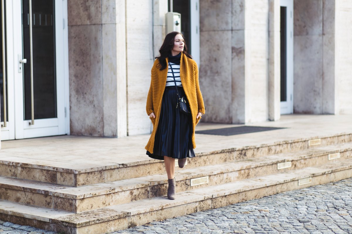 Zum quergestreiften Oberteil passt der Faltenrock sehr gut. Der Kontrast zwischen Querstreifen und Falten wirkt sehr spannend und verleiht dem Outfit noch mehr Spannung. Der orangefarbene Cardigan rundet den Look super ab. Ein zweiter Eyechatcher sind die taupfarbenen Stiefeletten, denn sie stechen durch ihre Optik ebenfalls sofort ins Auge. Der Taupe-Ton bildet eine harmonische Farbmischung mit dem satten Orangeton und verleiht dem Look noch mehr Farbtiefe.