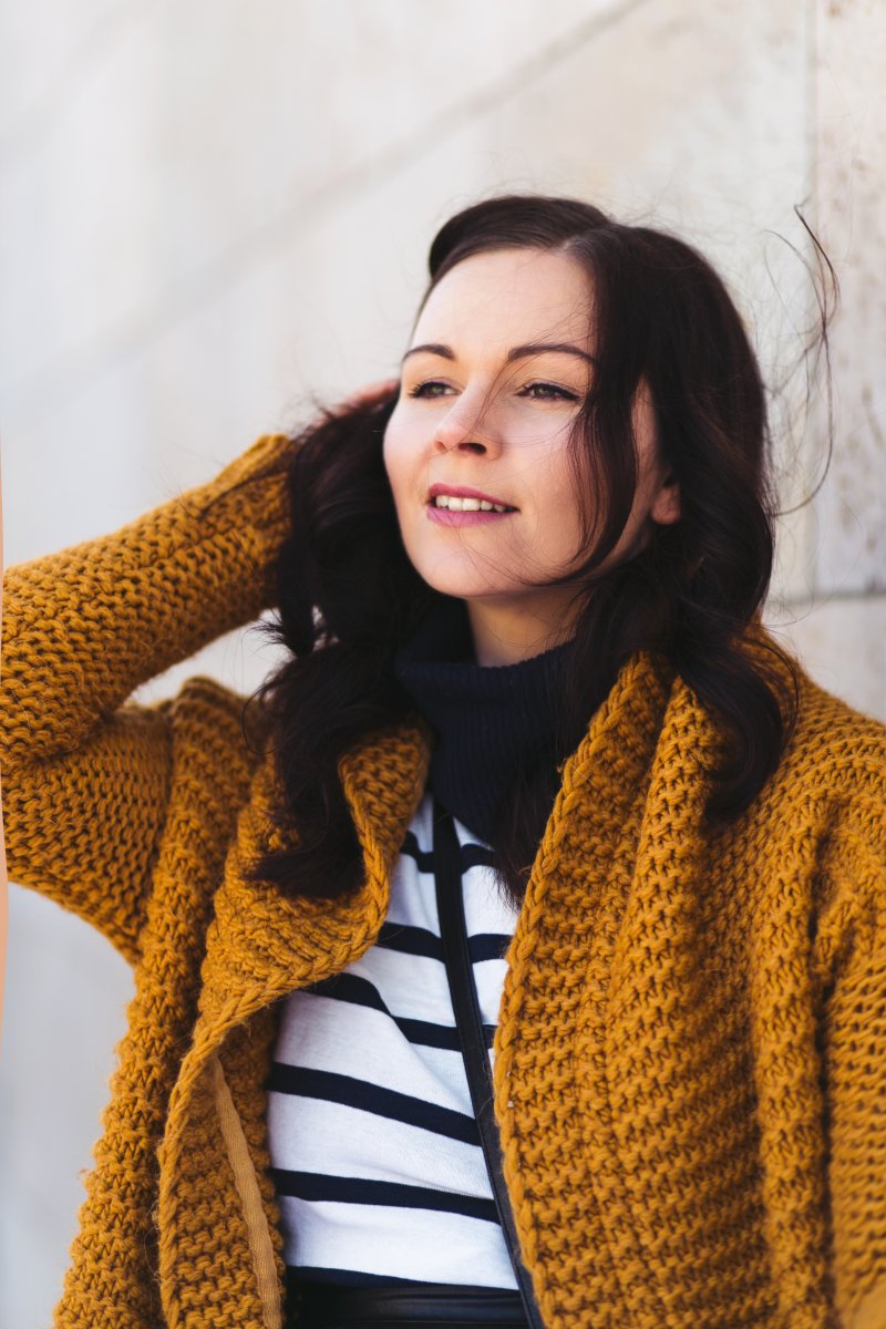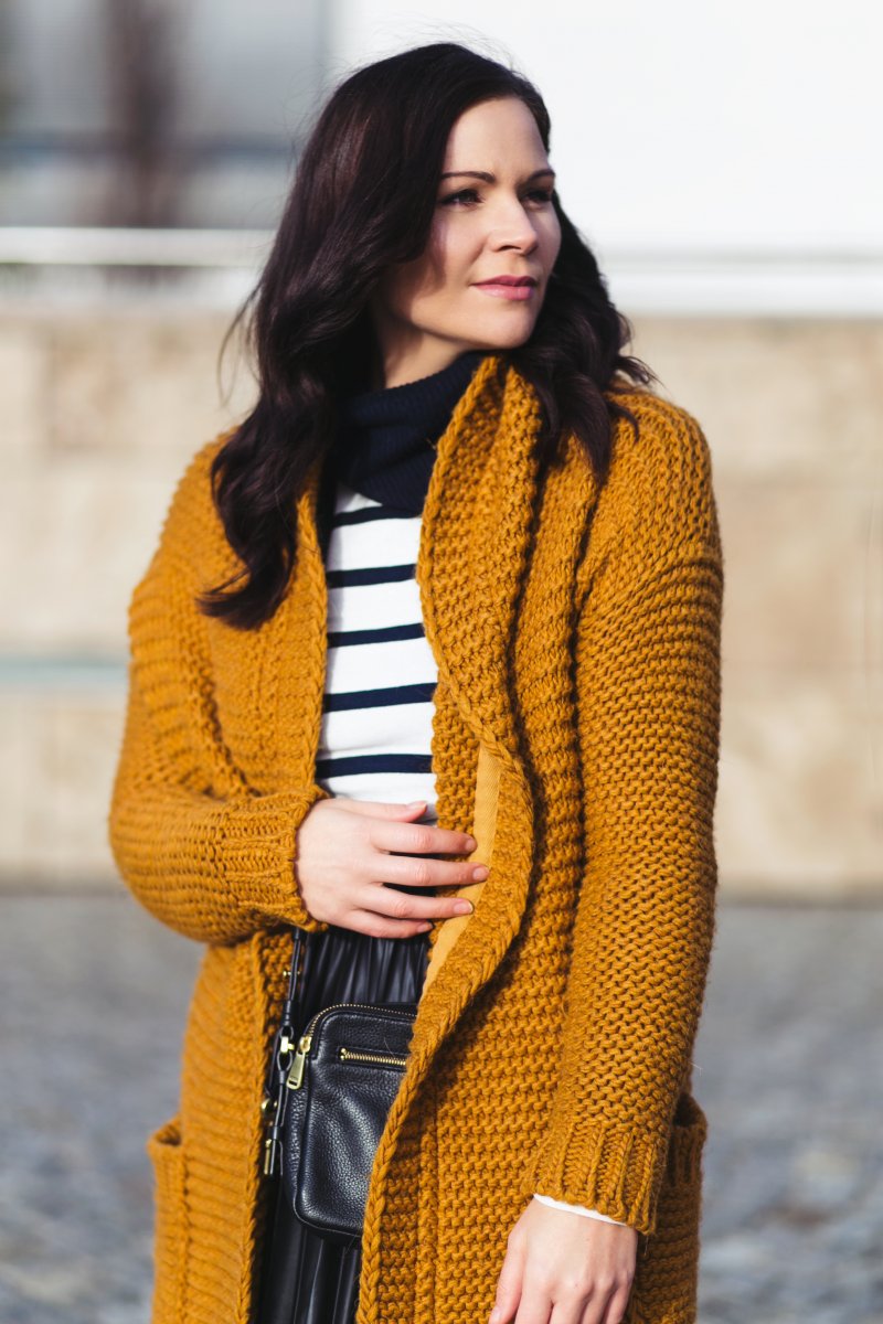 Der grob gestrickte Cardigan ist erst ganz frisch bei mir eingezogen und derzeit mein Favorit bei den sehr kühlen Temperaturen. Neben dem groben Strickmuster gefällt mir vor allem die Farbe, die der Cardigan zu bieten hat. Der satte Orangeton ist ein sehr schöner Farbtupfer in dem sonst sehr monochrom gehaltenen Outfit.