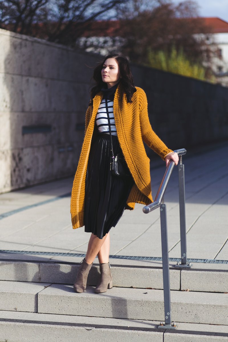 Strick und Leder sind schöne Begleiter für den Winter. Ich habe euch heute ein Outfit mit genau diesen zwei Begleitern kreiert. Ich kombiniere einen schwarzen Midi-Lederrock mit Streifenshirt und Circle Of Trust Strickcardigan – eine wahre Wohlfühl-Uniform für den Winter. Alle Details zu diesem Look findet ihr nach dem Sprung!
