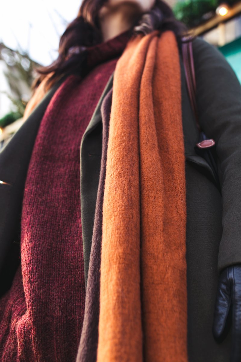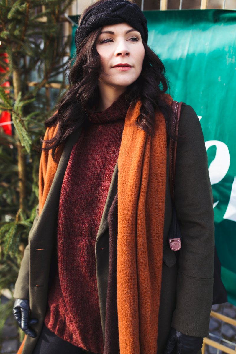 Mein heutiger Look ist nicht nur kontrastreich, sondern hat auch jede Menge Farben zu bieten. Inspiriert zu diesem Style hat mich der Weihnachtsmarkt, der mit Grün- sowie Rottönen jedes Jahr aufs Neue begeistert. Die Grüntöne habe ich mit dem dunkelgrünen Mantel von New Look abgedeckt und die Rottöne ja bereits mit dem Oversize Sweater. Für noch mehr Wärme sorgt der übergroße Schal in einem satten Orangeton, der an die warmen Holzbuden auf den Weihnachtsmarkt erinnert. Blau setzte ich als kleinen Eyechatcher in diesem Look ein und runde ihn damit ab!