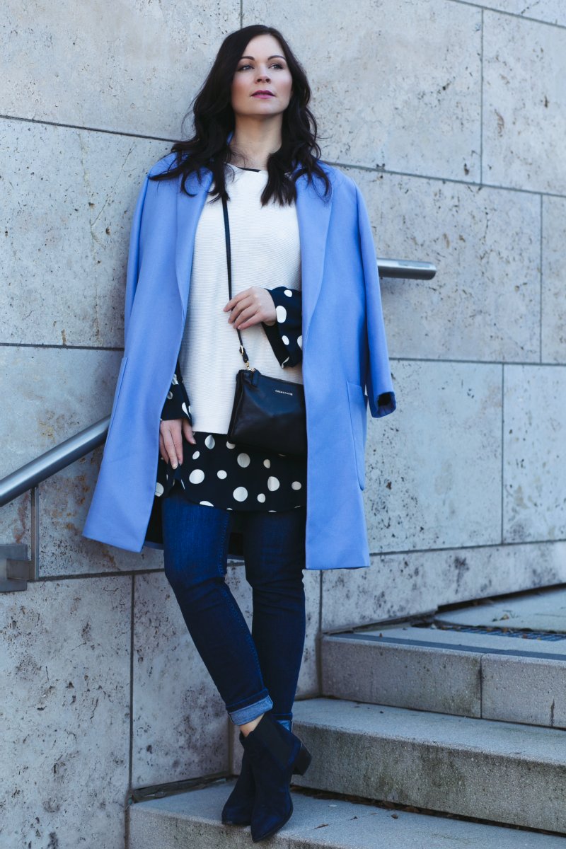 Layering mit blauem Mantel, Pünktchenkleid und Strickpullover kombinieren