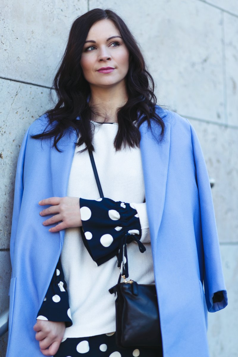 Der Mantel ist wirklich sehr hübsch und die kühle Farbe steht deinem Teint super! Ich steh auf Pünktchen-Kleider, und die Trompetenärmel von deinem sind wirklich süss 🙂