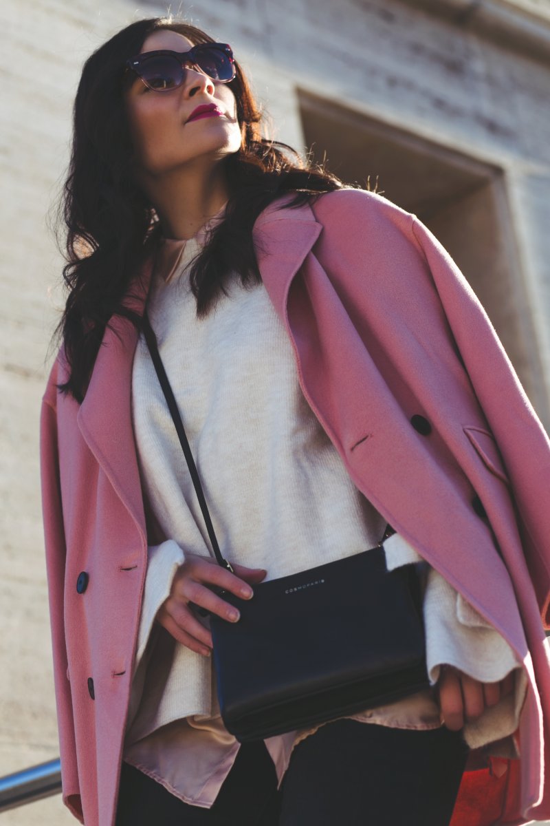 Standardmäßig ist die Winteruniform geprägt von Weiß, Beige, Grau und Schwarz. Ich nehme mich da nicht aus und ertappe mich immer wieder, wie ich zu denselben typischen Winterfarben in meinem Kleiderschrank greife. Nur selten wage ich es und greife nach einem farbenfrohen Kleidungsstück im Kleiderschank. Doch mit dieser Tristesse möchte ich brechen und achte in diesem Winter bewusst auf meine Farbwahl, wenn ich in den Kleiderschrank greife. Ein Kleidungsstück, das meinen Farbkriterien entspricht, ist der pastellrosa Wintermantel, der jedes Outfit zum Strahlen bringt.
