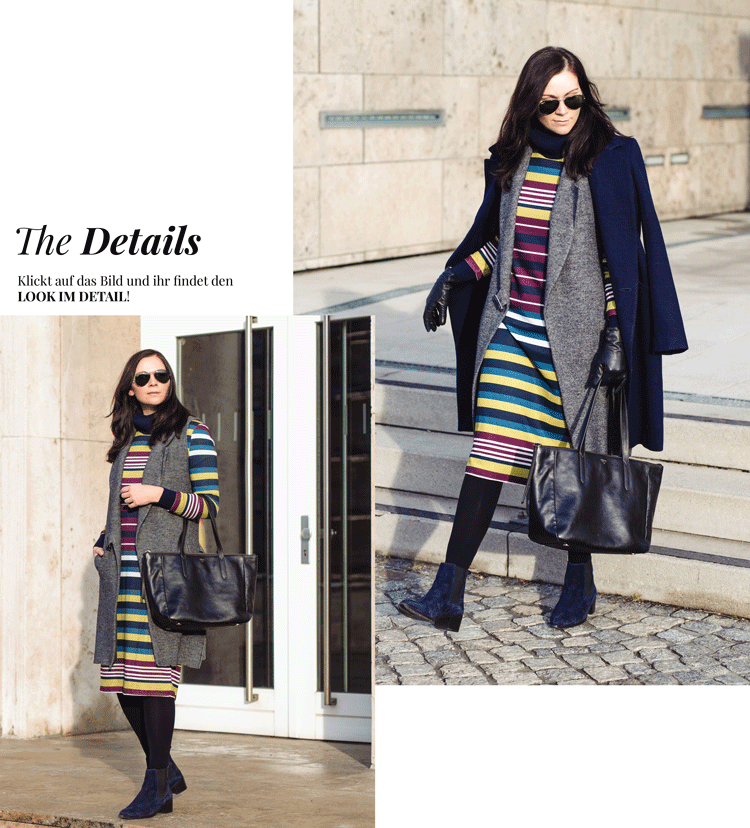 Das erste Winter Key-Piece ist die Wollweste. Sie trage ich supergerne auf Kleidern oder über dünne Pullover. Die Weste spendet mir zusätzlich Wärme und macht das Outfit noch eine Spur eleganter. Auch ausgefallene Kleider erdet so eine Weste ungemein. Ein sehr schönes Beispiel dafür, ist mein Look mit Outfit mit gestreiftem Midikleid, Wollweste und Ankle Boots.