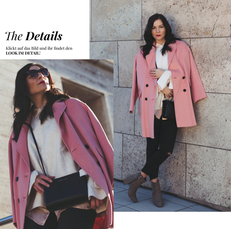 Wenn mich einer im Winter so richtig warmhält, ist das der Strickpullover. Egal, ob schlicht oder schrill, der Pullover hat immer einen Platz in meinen Winteroutfits. Das beste Beispiel ist mein Style mit pastellrosa Mantel. In diesem Outfit hält sich der Pulli dezent im Hintergrund und überlässt dem knalligen Mantel den Vortritt. Durch die rosafarbene Seidenbluse und die elegante Schnürung am Handgelenk hat der Pullover einen sehr eleganten Auftritt.