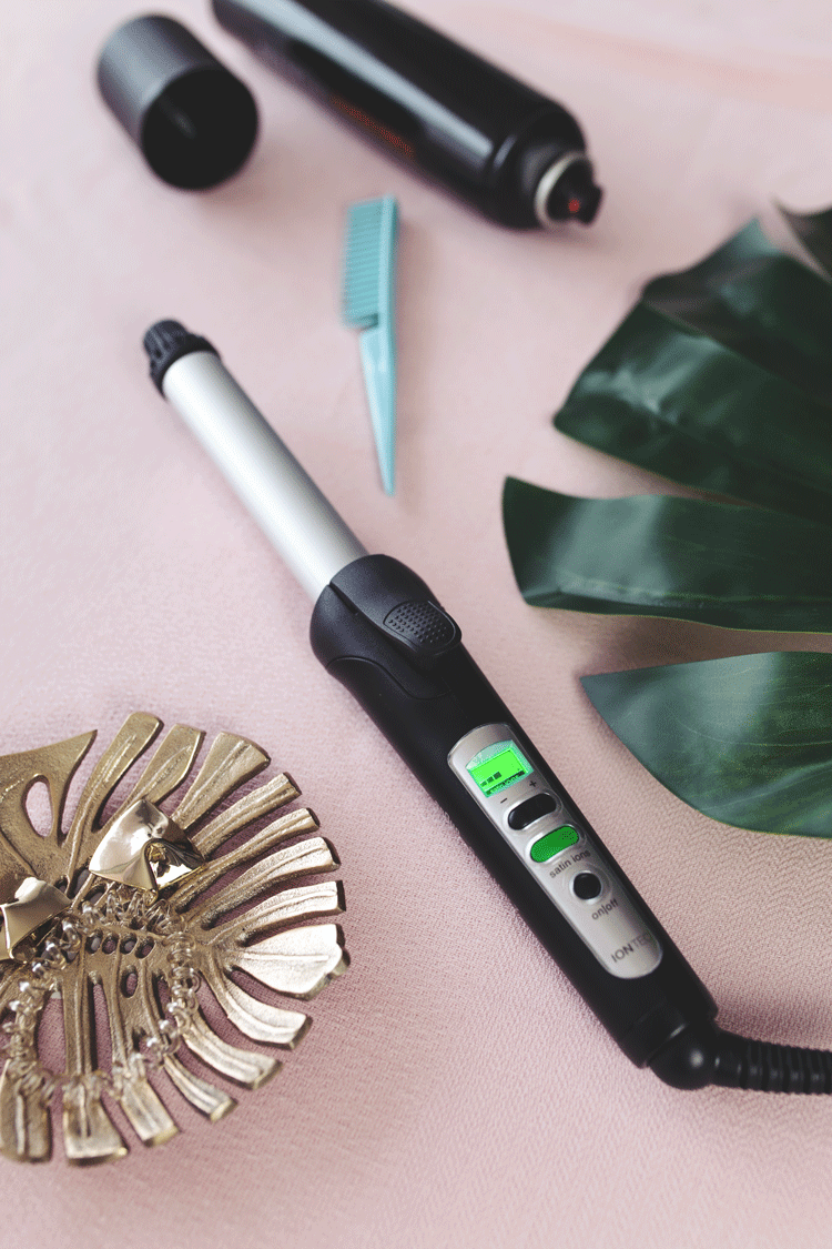 Anschließend schalte ich den Braun Satin Hair Lockenstab ein und betätige zusätzlich den Satin-Ion Knopf. Den der Lockenstab ist nicht irgendein Lockenstab, in ihm steckt eine Satin-Ion Technologie, die schimmernde Locken und Glanz verspricht. Durch die Satin-Ion Technologie wird die Feuchtigkeit im Haar gebunden und das sorgt für einen seidigen Glanz. Außerdem wird durch die Technologie ein anti-statischer Effekt erzeugt, der die Haare im wahrsten Worte „am Boden hält“ – perfekt für meine störrischen Haare.