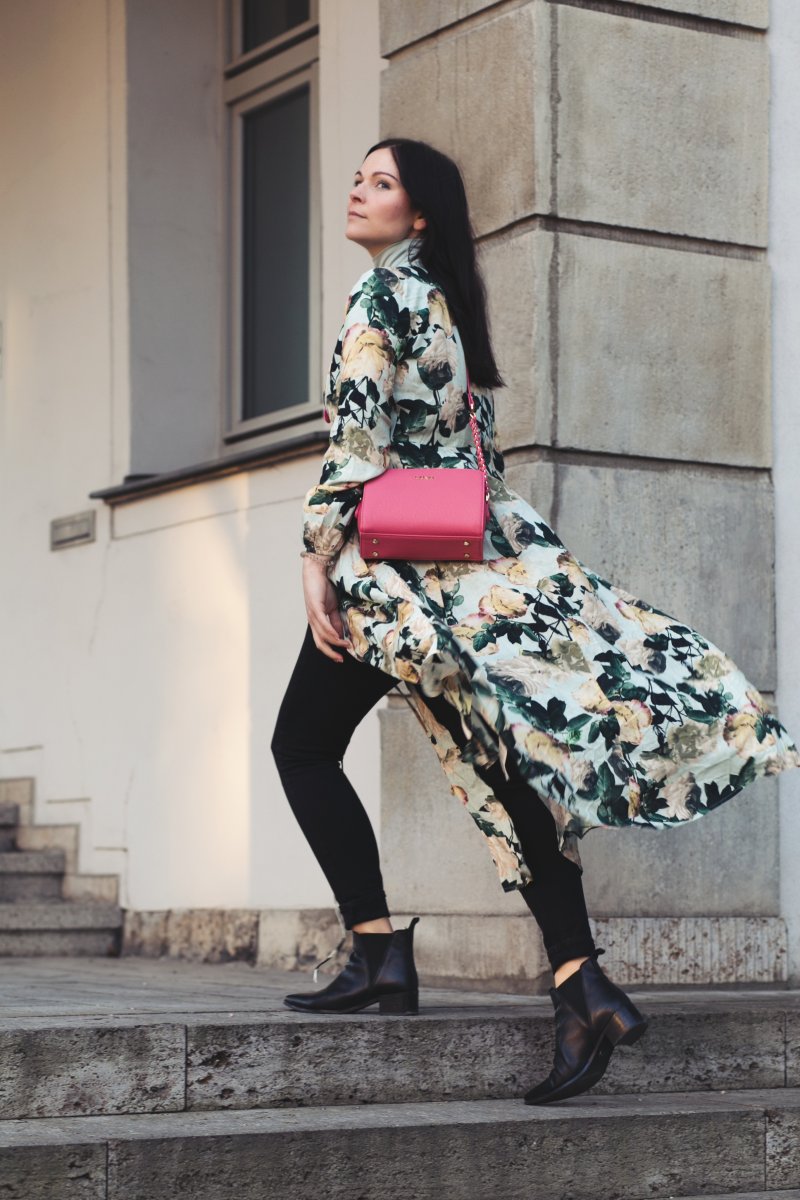 Als ich das Wickelkleid von H&M das erste Mal sah, wusste ich, dieses Kleid muss ich haben. Vor meinem inneren Auge kreierte ich schon diesen Look, den ich euch heute präsentieren möchte. Im Mittelpunkt, wie könnte es anderes sein, steht das Wickelkleid mit Blumenprint. Wie ihr wisst, trage ich für mein Leben gerne Kleider, vor allem in der Kleid-über-Jeans-Variante gab es hier schon einige Styles zu sehen. Zum Beispiel diesen mit meinem Tupfenkleid oder dieses Outfit mit Slipdress.