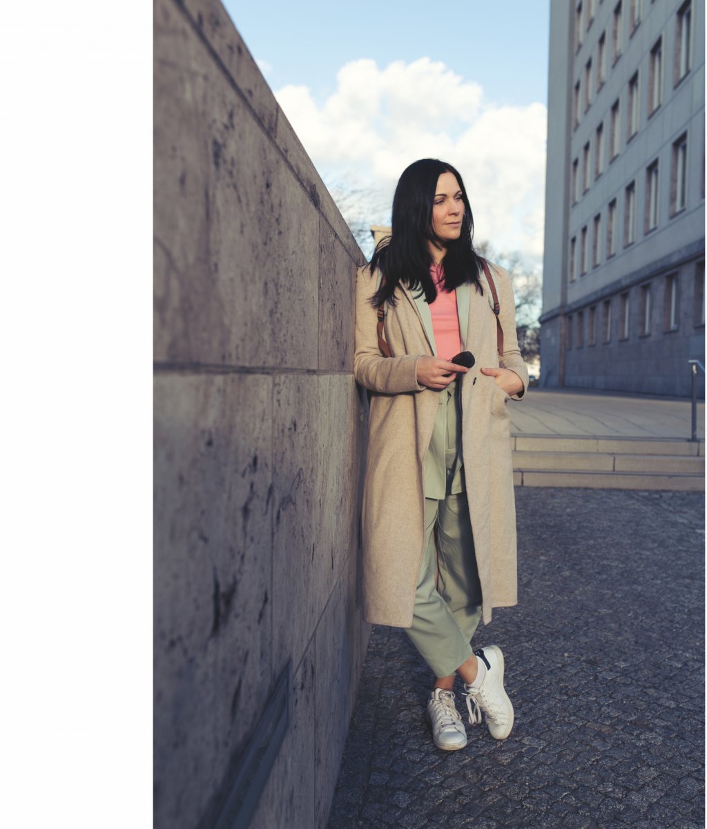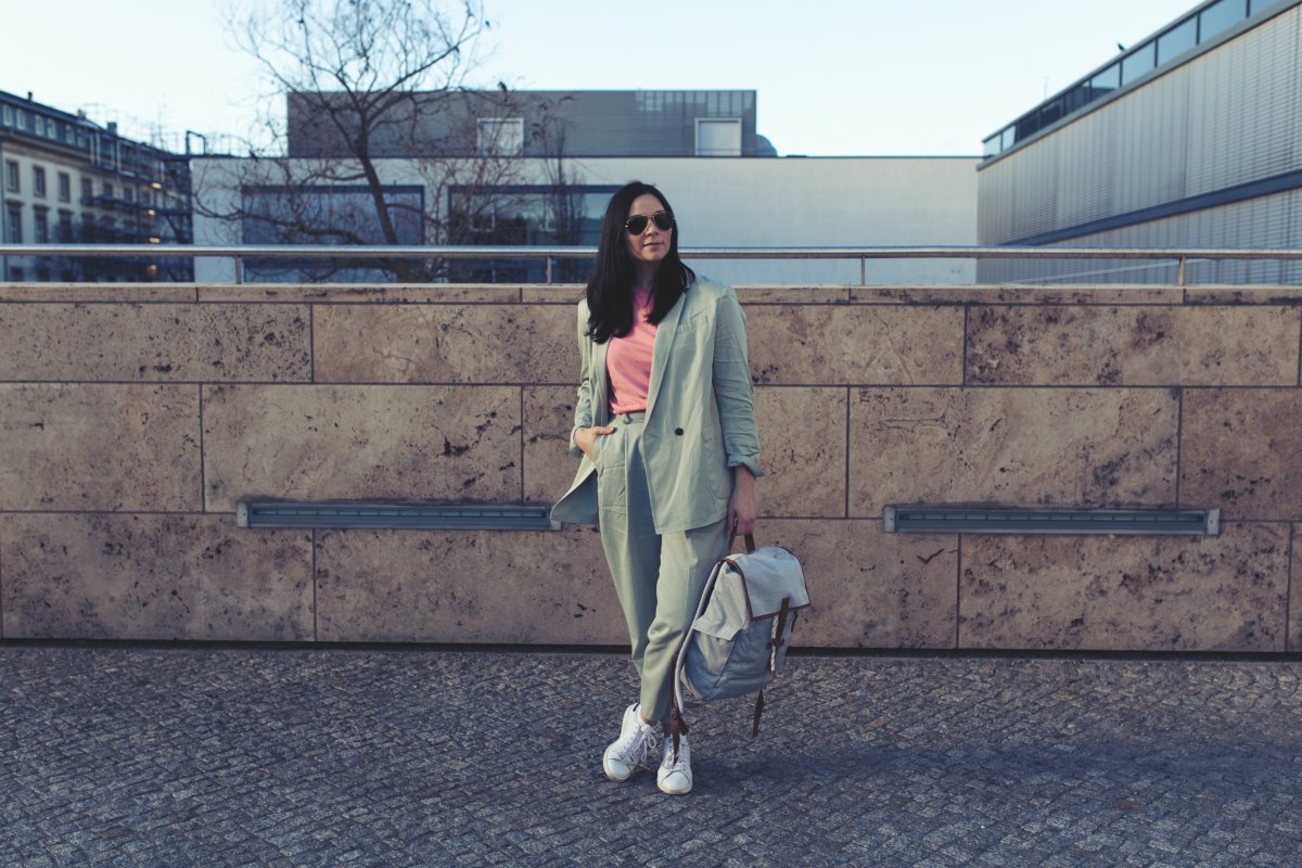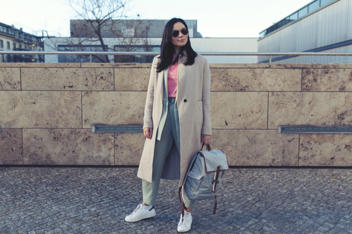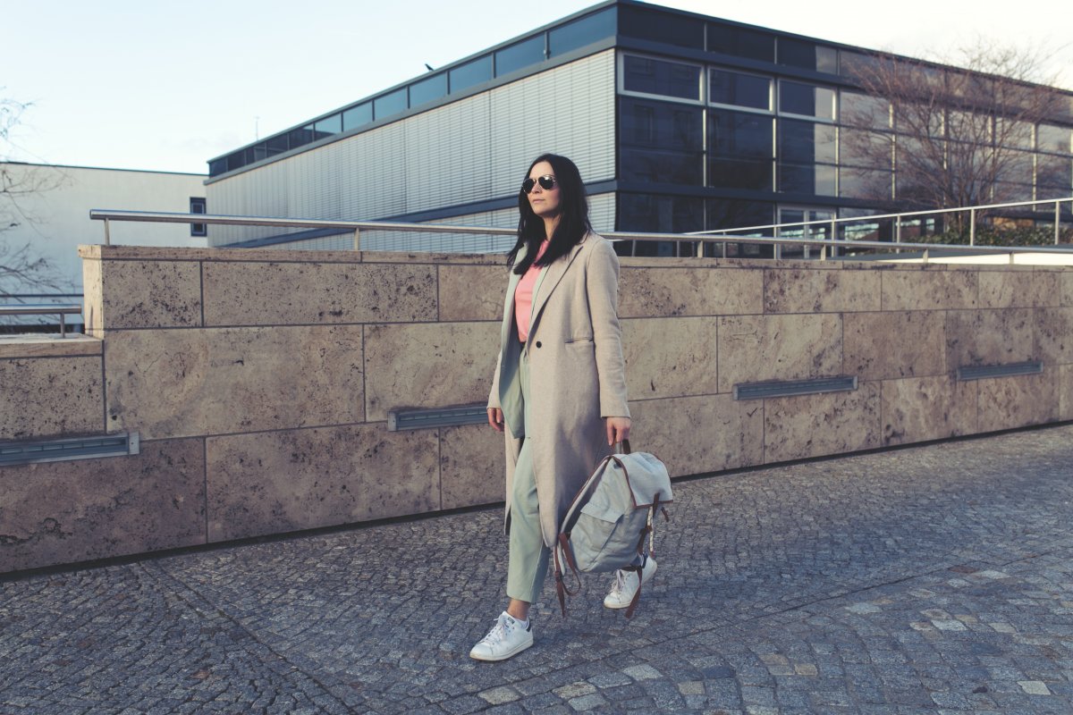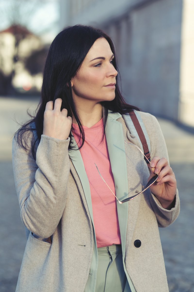 Im Frühling ist Farbe bei mir ein Muss. Am liebsten trage ich einen Mix aus Pastell und Pop of Color. So wie auch heute, in meinem Outfit für das Fashionkarussell. Ich kombiniere einen pastellgrünen Hosenanzug zu einen knall-pinken Shirt von Kauf dich Glücklich. Eine gewagte Kombination, die sich aber durchaus sehen lassen kann. Obwohl es superschönes Sonnenwetter an diesem Tag war, darf der Mantel bei mir nicht fehlen. Denn es trotz der warmen Sonnenstrahlen noch sehr frisch, wenn ich aus dem Haus gehe. Warmhalten ist deshalb Pflicht.