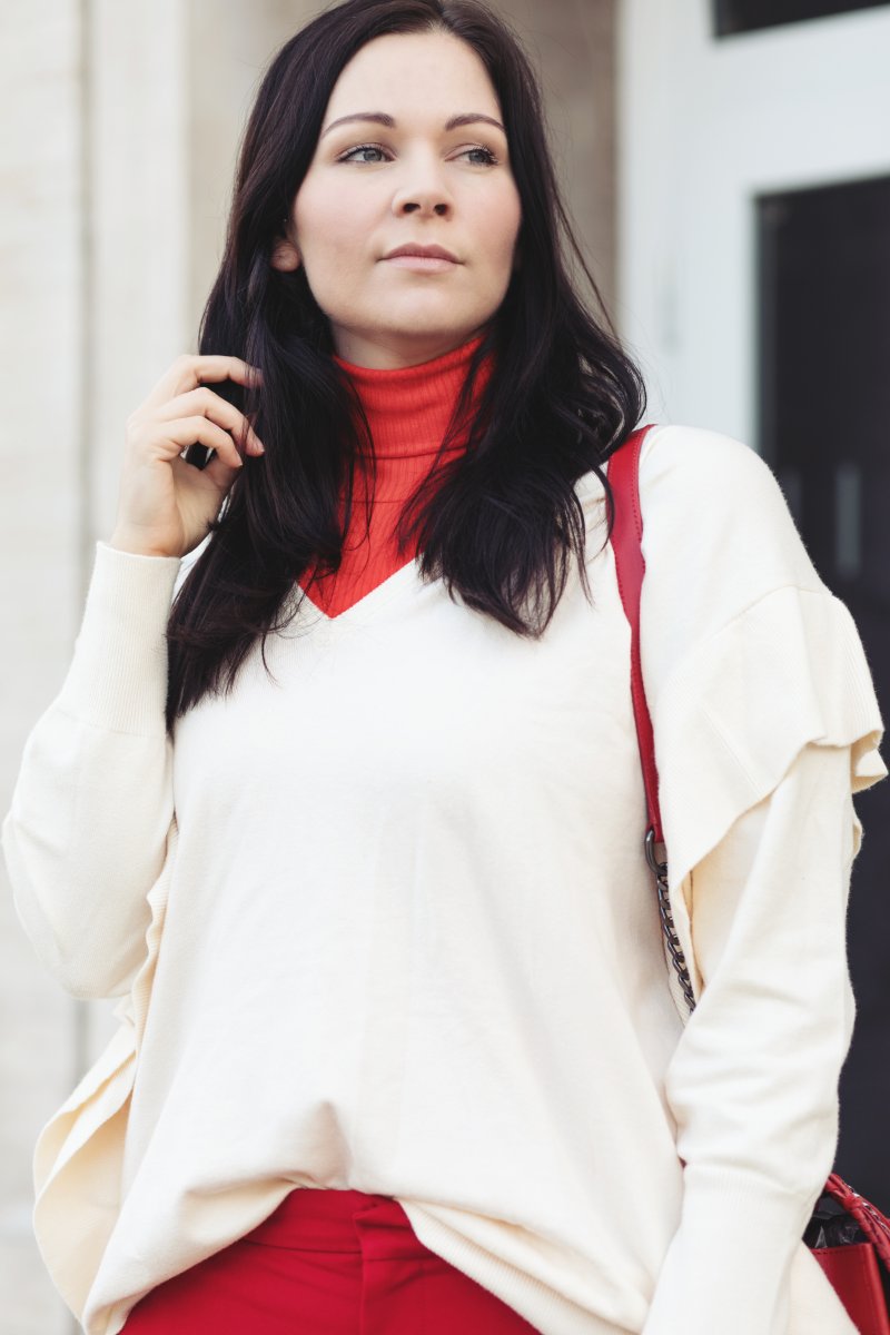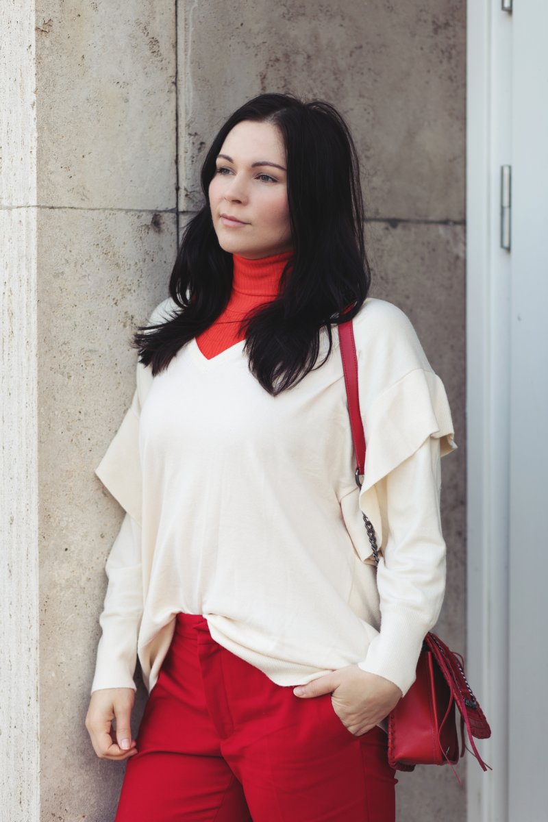 In meinem heutigen Look habe ich zu einer rot-weißen Farbkombination gegriffen, die sowohl sportlich als auch elegant aussieht. Der zeitlose Klassiker in diesem Look ist definitiv die rote Chino-Hose. Mit so einer Hose macht man immer eine gute Figur, egal ob in der Freizeit ist oder im Büroalltag. Dazu habe ich ein rotes Rollkragen-Top kombiniert, dass in der Farbnuance etwas heller ist als die Chino-Hose, das verleiht den Look mehr Lebendigkeit. Das Top kommt euch bestimmt bekannt vor, denn ihr kennt es schon aus meinem Outfit mit Trenchcoat und Streifenshirt.