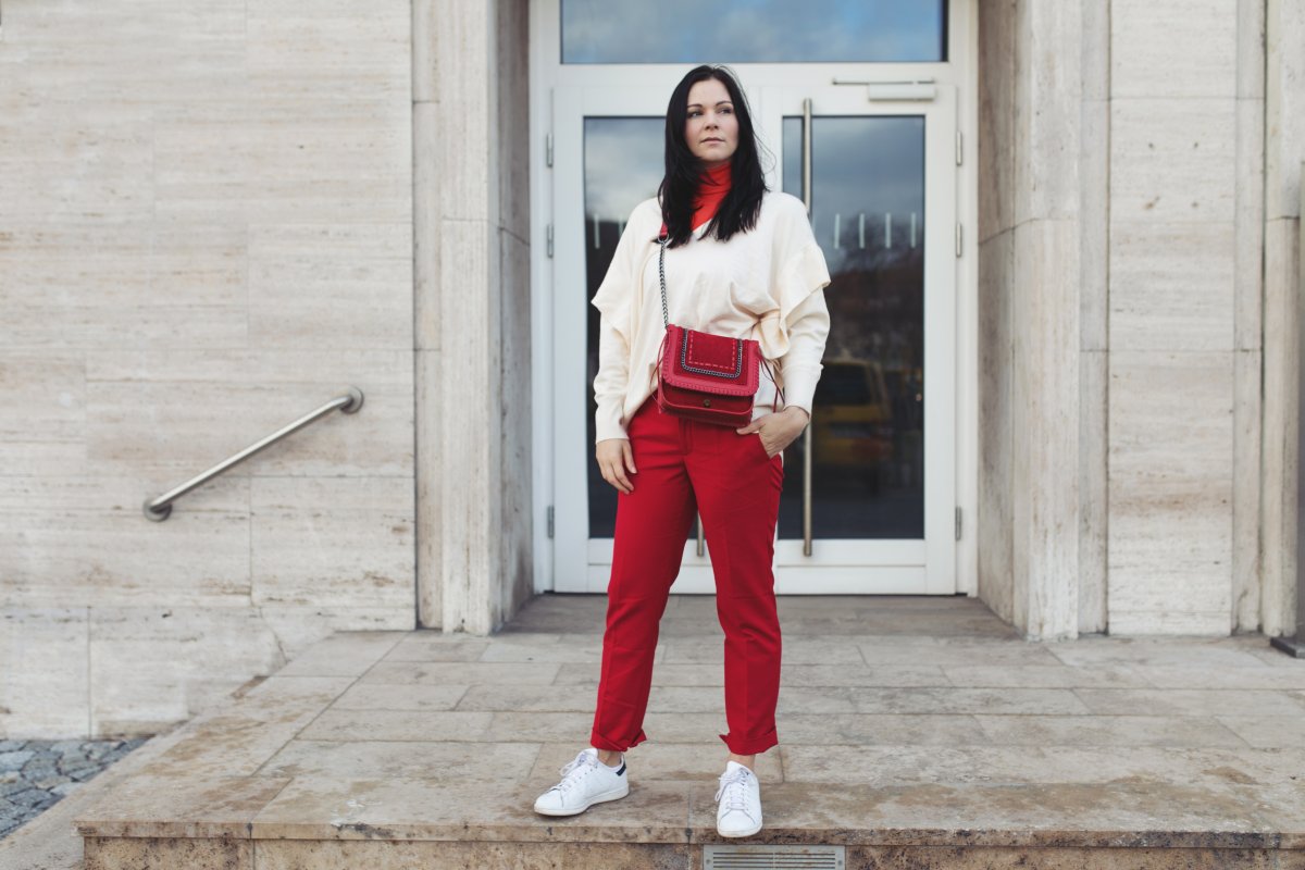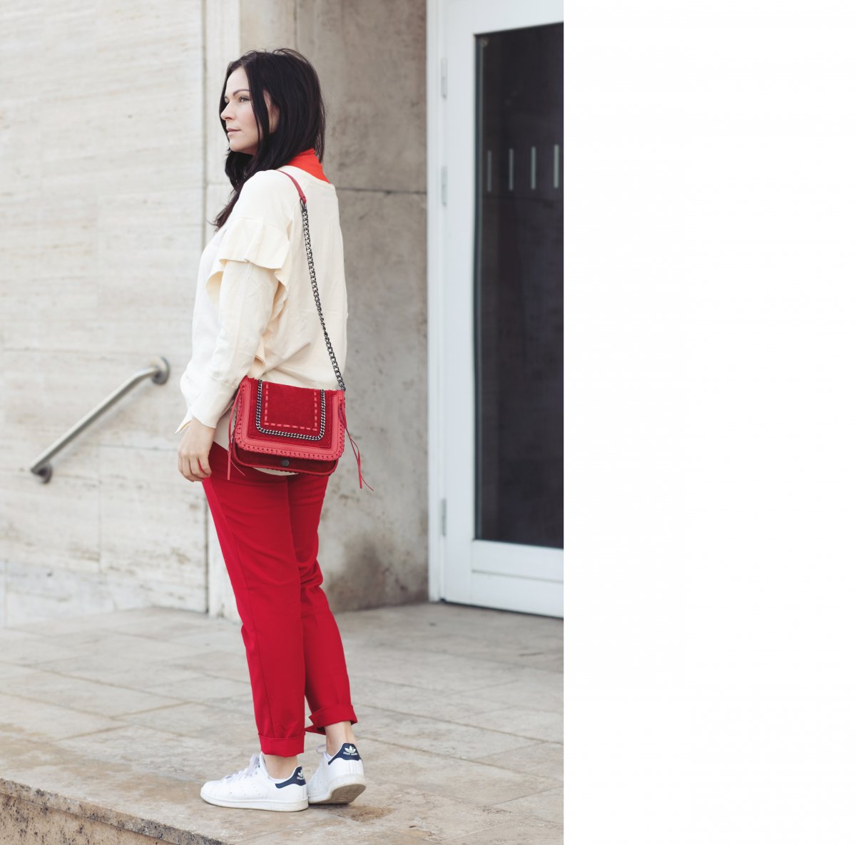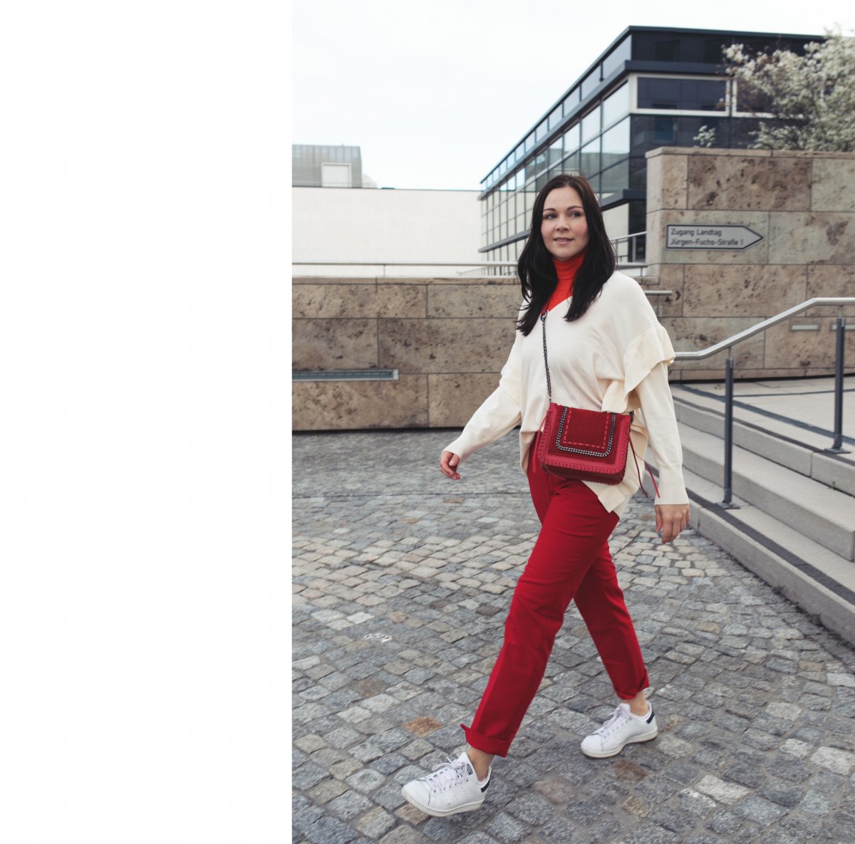 Auch heute findet es seinen Einsatz unter einem Pullover, aber diesmal einen ganz schlichten weißen mit Volant Details an der Seite. Diese verspielten Details verleihen dem Look noch etwas Extravaganz und Chickness, was mir vor allem bei sportlichen Looks sehr gut gefällt. Da darf es an den Füßen auch gerne mal sportlicher sein. Hier setzte ich auf einen alten Hasen in meinem Schuhschrank, meine geliebten Stan Smith Sneakers von Adidas. Ich mag diesen Schuh einfach unglaublich gerne, denn er ist für mich ein zeitloser Begleiter, der sich dezent im Hintergrund hält und dadurch in zahlreichen Outfits seinen Platz findet. Abgerundet wird mein Look mit der roten Tasche, die den rot-weißen Look den letzten Schliff verleiht und durch die metallischen Details noch einmal mehr für Aufsehen sorgt.