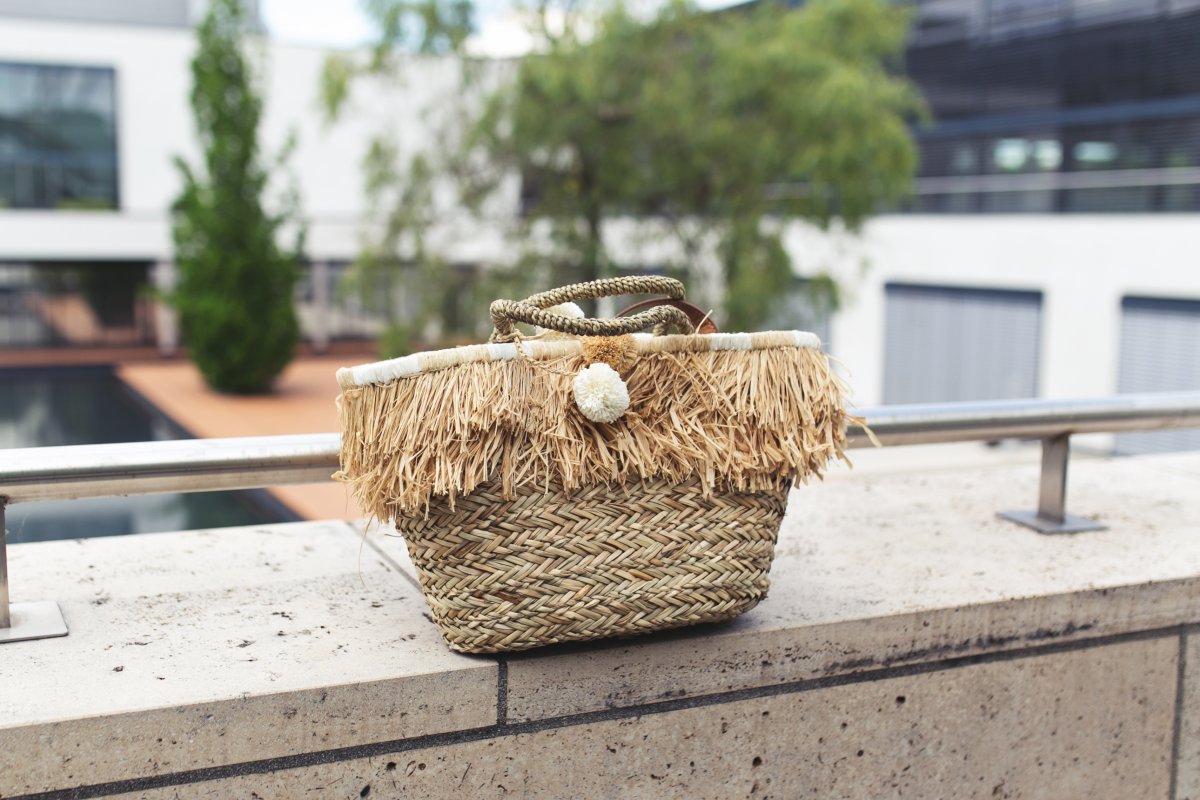 Zu dem auffälligen Midikleid kombiniere ich nur wenige Accessoires. Ich wähle beige Slingback Pumps und eine Strohtasche, die jede Menge Platz bietet, zu diesem Style. Besonders gut an diesem großen Strohkorb gefällt mir, dass er oben geschlossen werden kann – so weiß ich mein Hab und Gut sicher verstaut und muss es nicht ständig im Auge haben.