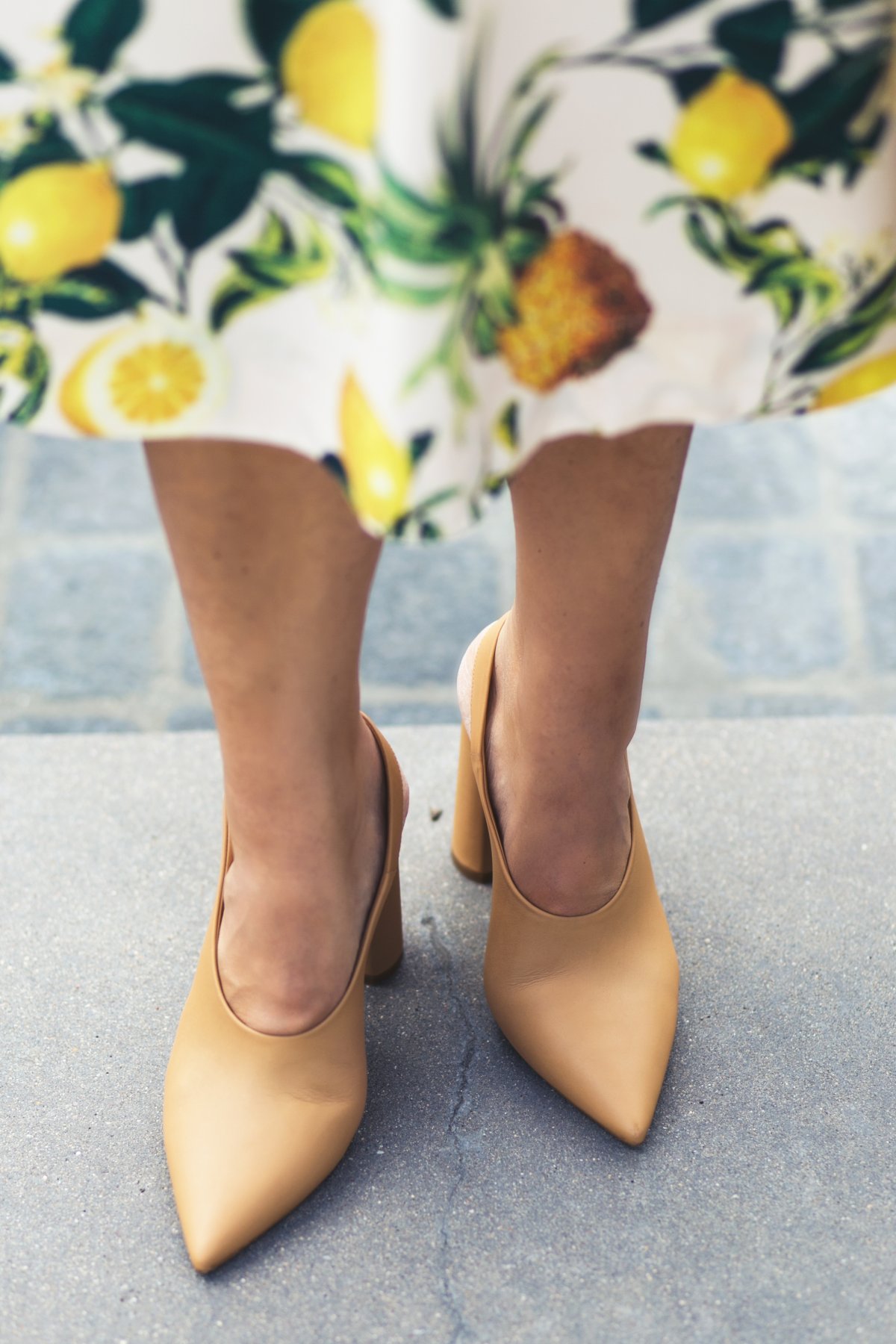 Diesen Sommer trage ich Midikleider mit Zitrusprints zu Slingback-Pumps und Strohkorb