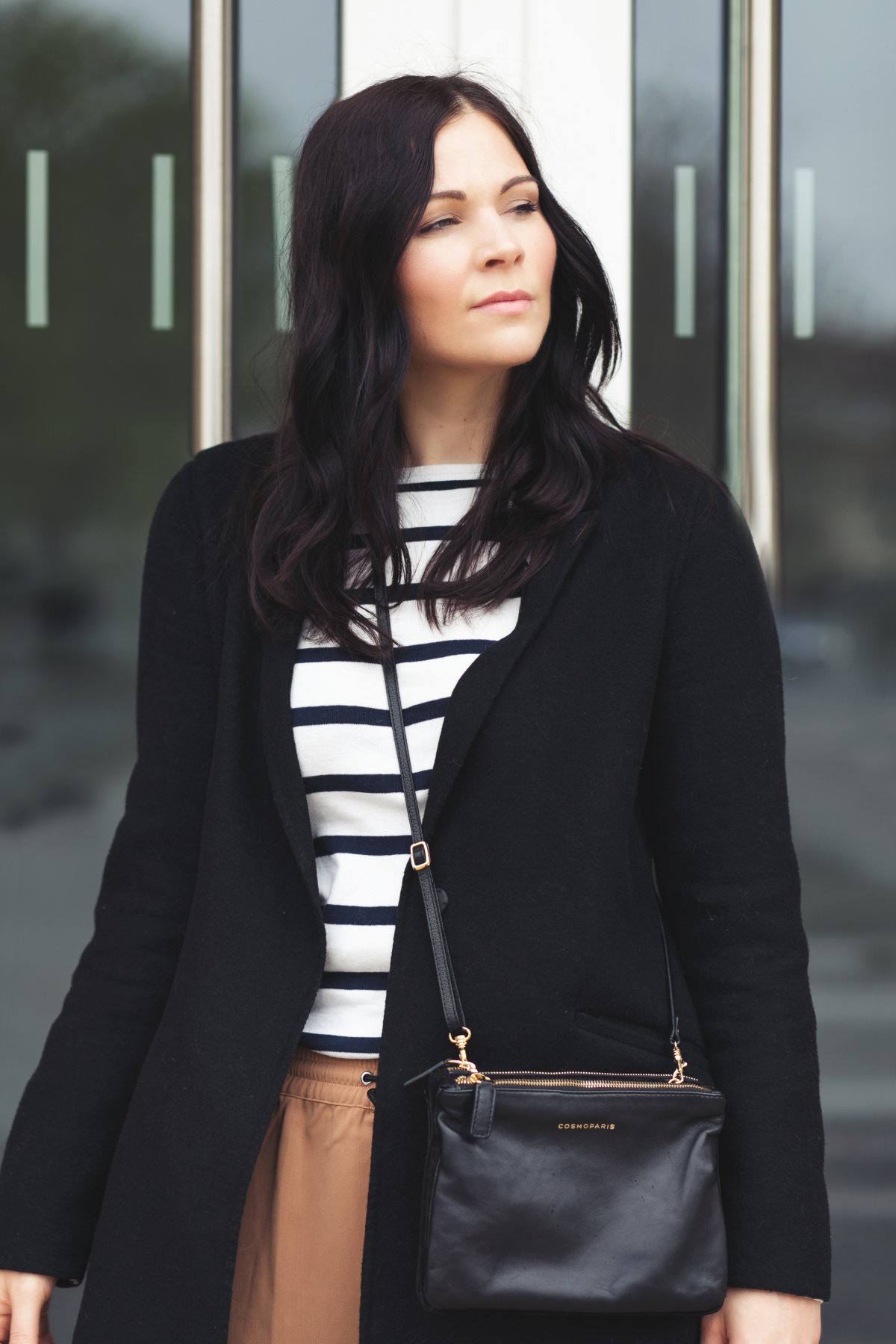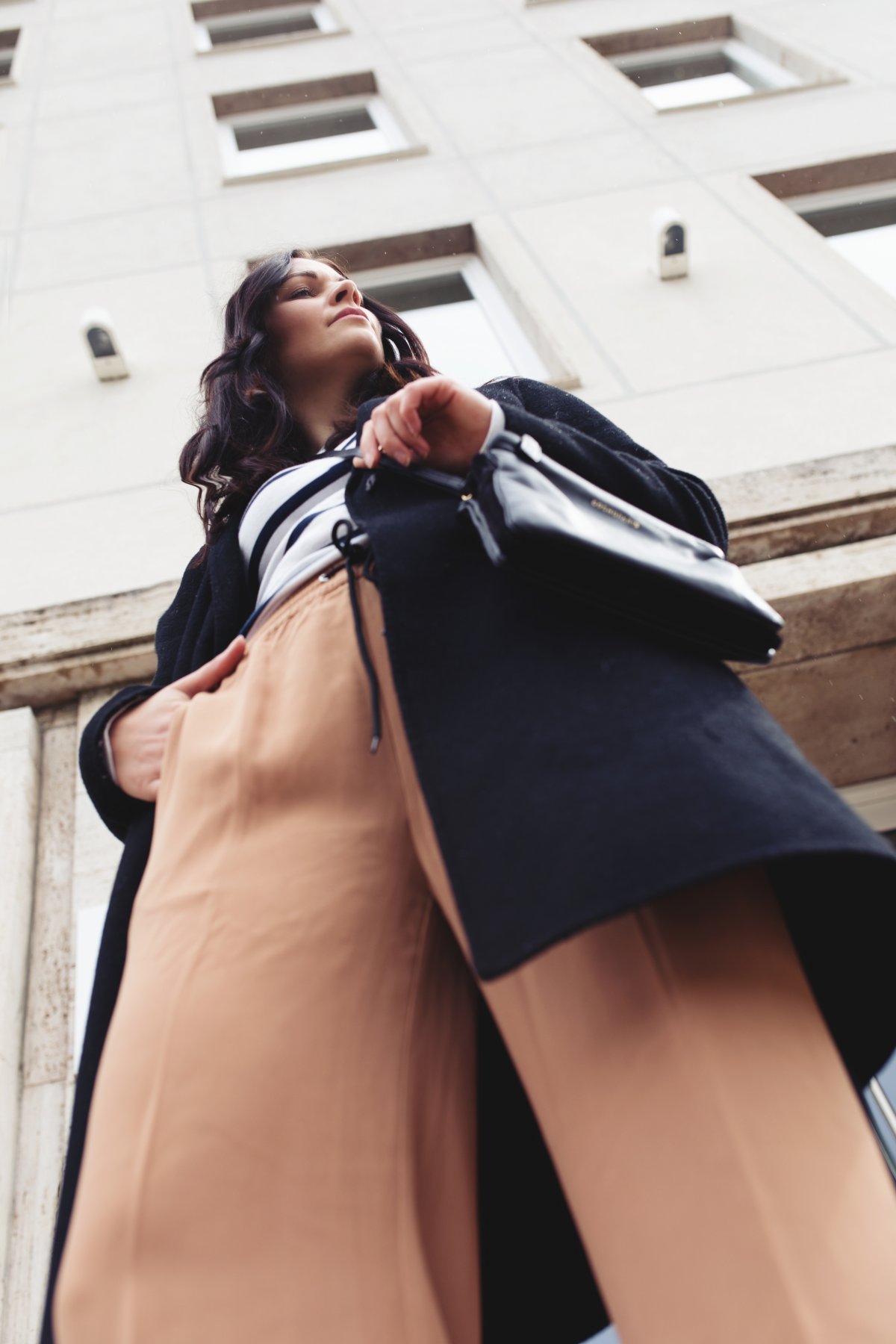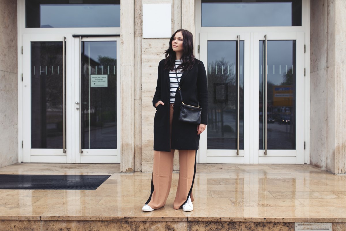 Weil das Wetter derzeit eher an Herbst als an Frühling erinnert, trage ich zu meinem Jogginghosen-Look einen schwarzen Mantel von Zara. Der zeitlose Mantel verleiht dem ganzen Look eine alltagstaugliche Chicness, die sich sehen lassen kann. Auch die kleine, schwarze Trio-Bag von Cosmoparis, ist ein eleganter Eyecatcher bei diesem Style.