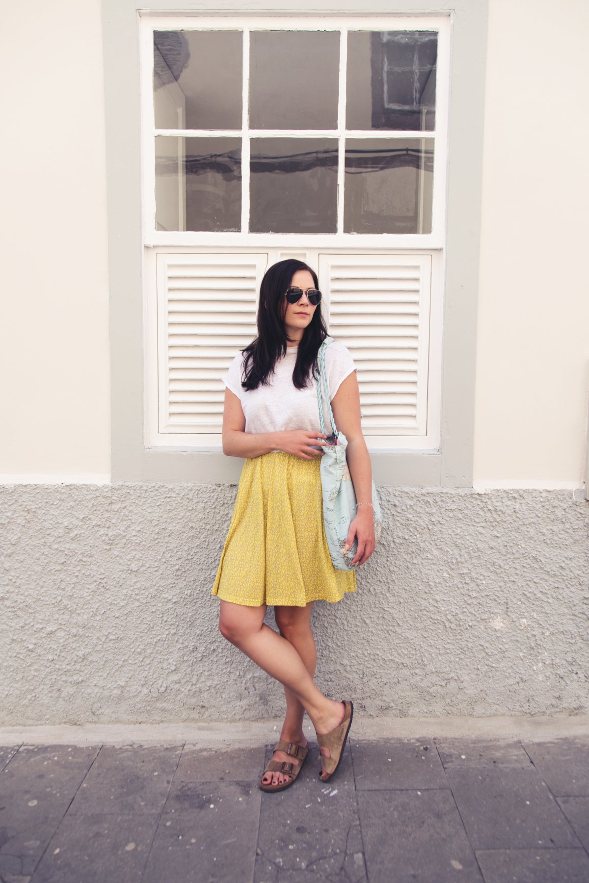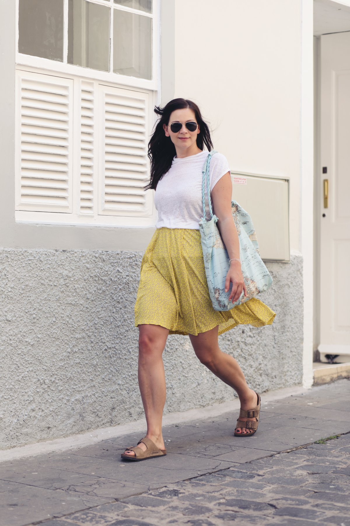 www. Kleidermaedchen.de Modeblog, Erfurt, Thueringen, Leipzig, Fashionblog, Fashion Blog, Magazin, Blogazine, Influencer Marketing und Kommunikation, Creator, Jessika Weisse, Fashionblog, Fashion Magazin, Fashion Blog, Outfitblog, Blogger Outfit Inspiration, Streetstyle, Modeblog, Travelblog, Gran Canaria, Sommer Outfit, Hessnatur Rock, Birkenstock Arizona Sandalen, Ray-Ban Aviator Sonnenbrille, Sonnenbrillen Trends 2017, Lifestyle Magazin, Casual Sommer Style mit gelben Hessnatur Rock und Ray-Ban Aviator Sonnenbrille, Mode Trend: Gelb, Las Palmas Gran Canaria, Urlaubsoutfit, Sommerurlaub