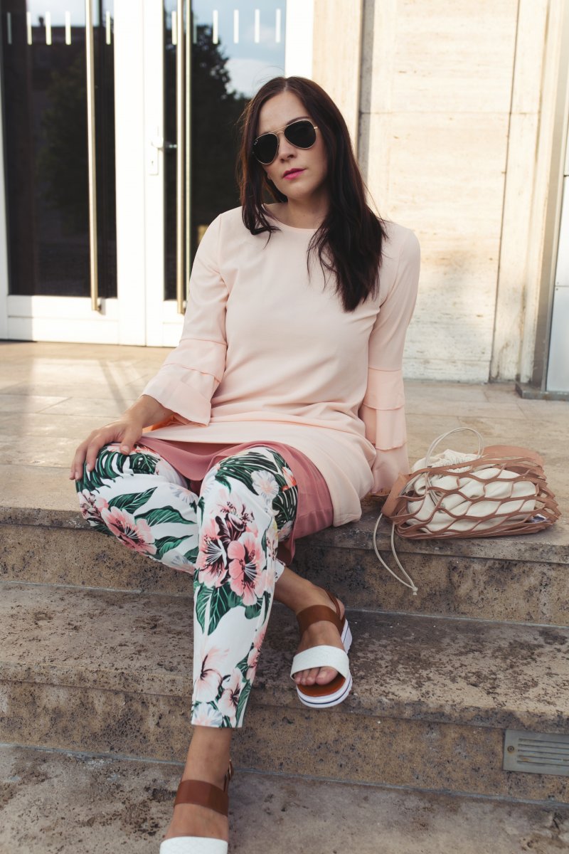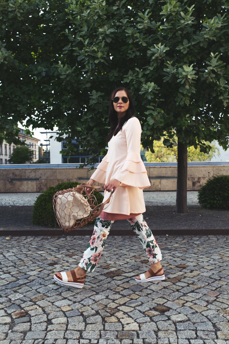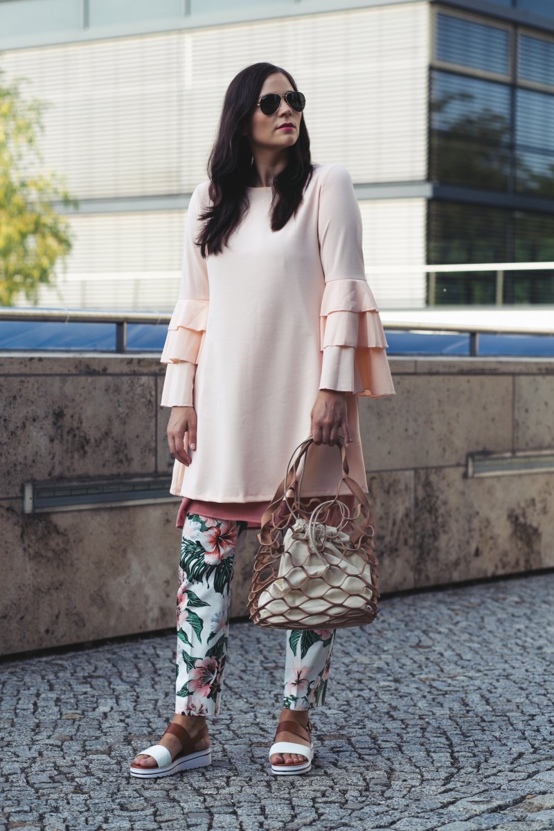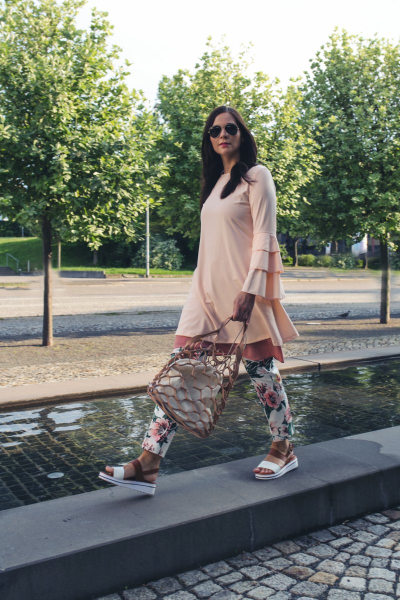 Ich habe diesen Look schon auf Instagram bestaunt. Ich finde die Kombination aus Blumenhose und Volantkleid super schön und dass das Slipdress ein wenig rausschaut, macht das Ganze noch spannender. 🙂