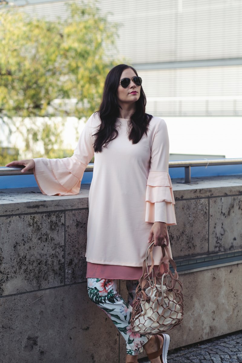 das Outfit ist wunderschön! 🙂 Das Volantkleid ist einfach ein Traum und in Komination zu der Hose gefällt es mir sehr. Der Print der Hose ist der absolute Hingucker! Toll! 🙂