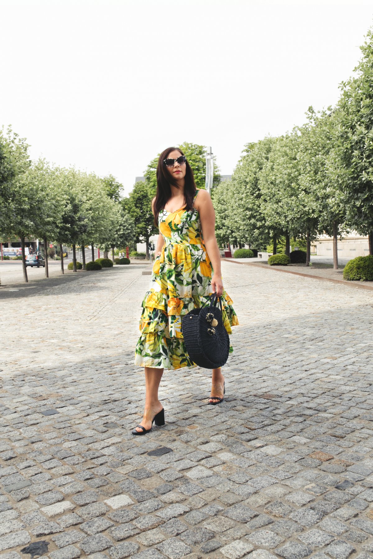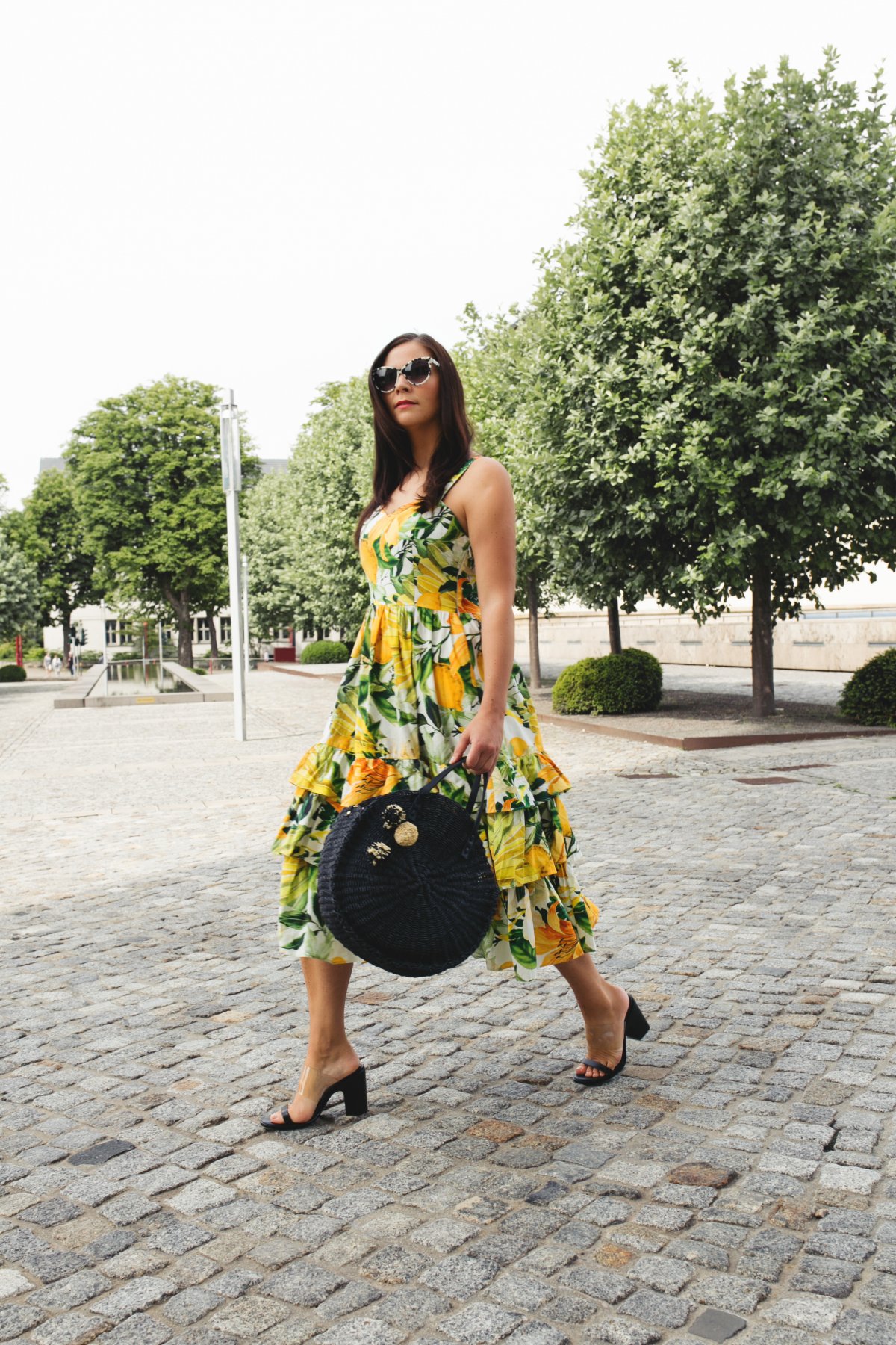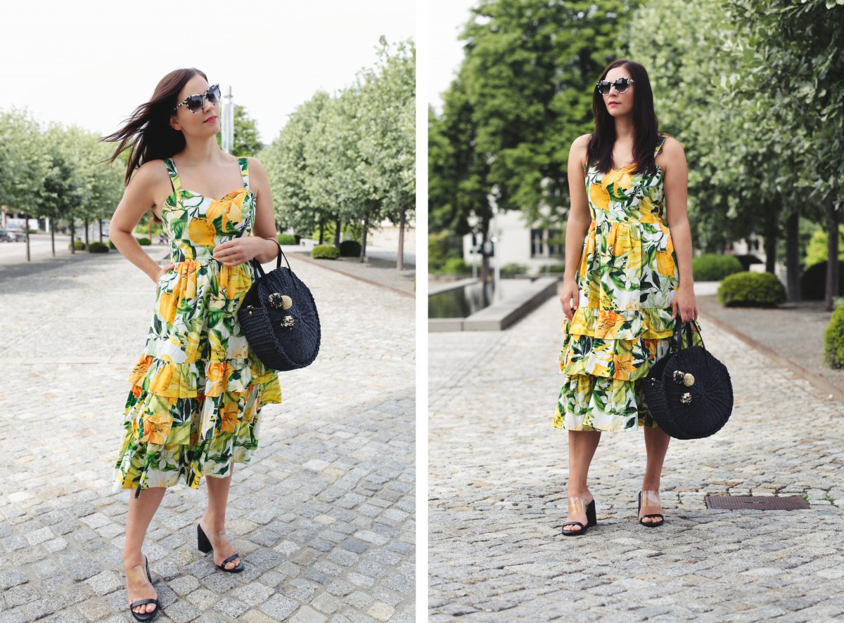 Diesen Sommer setzte ich besonders gerne auf Kleider mit auffälligen Prints, das habe ich euch schon in meinem Outfit mit Zitrusprintkleid hier auf dem Outfitblog gezeigt. Aber auch das klassische Blumenmuster gepaart mit ein Paar Rüschen, kann Frau im Sommer sehr gut angezogen erscheinen lassen.