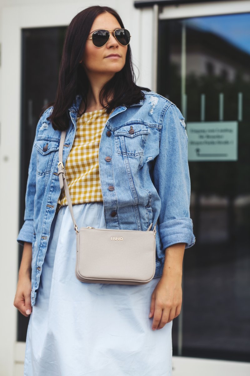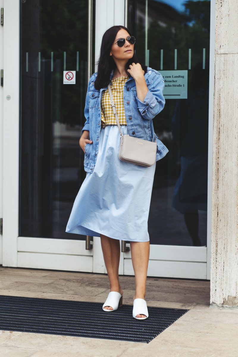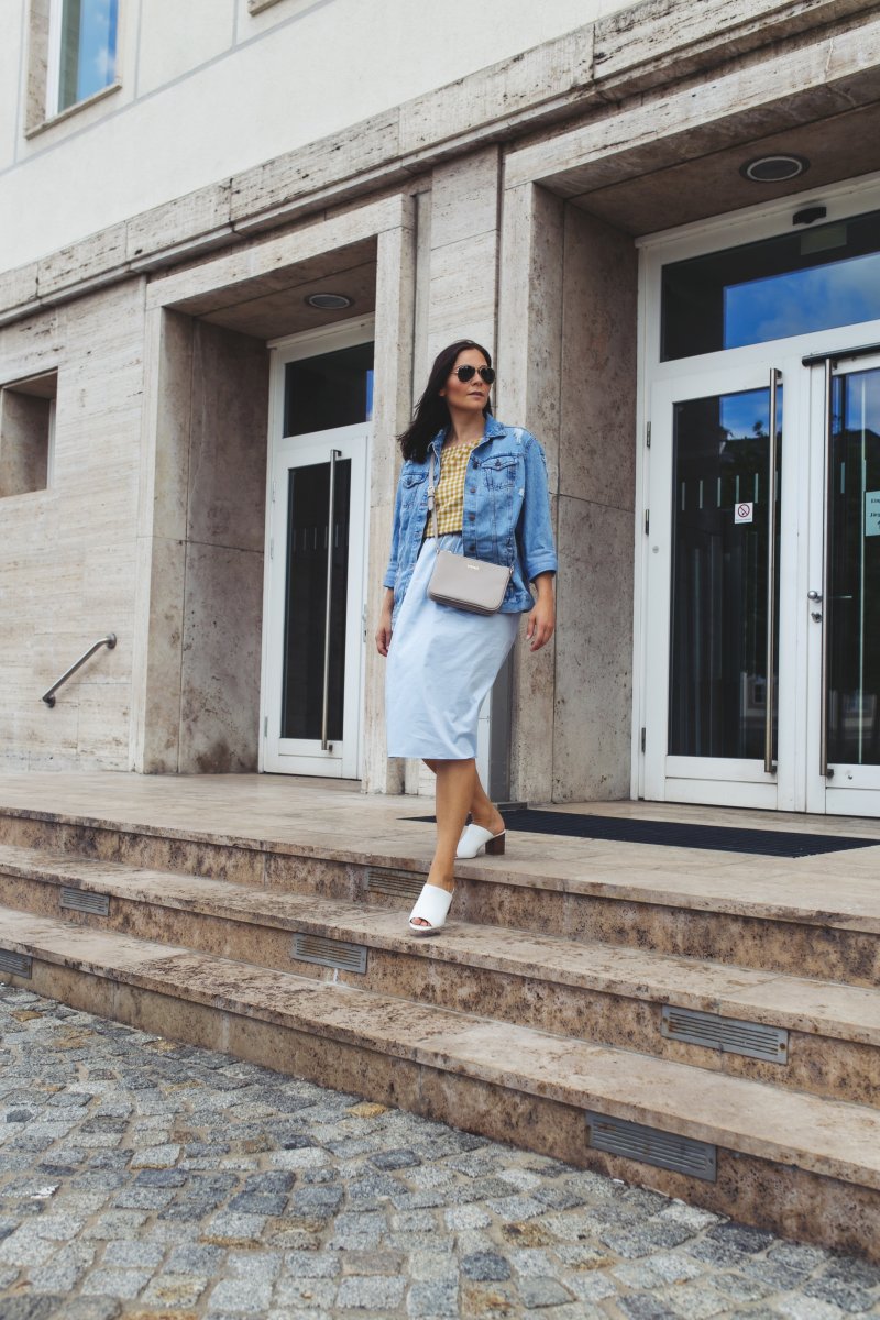Werbung. Elegant aber bequem: Darum dreht sich heute alles auf dem Outfit Blog. Ich zeige euch, wie ihr mit einer Oversize Jeansjacke, Midirock und karierter Bluse ein elegantes Outfit kreiert, das an Bequemlichkeit nicht zu übertreffen ist. Außerdem verrate ich euch, auf welche Absatzschuhe ich im Alltag setzte, wenn ich den ganzen Tag auf den Beinen bin. Dies und alle Details über das Outfit erfahrt ihr nach dem Sprung!