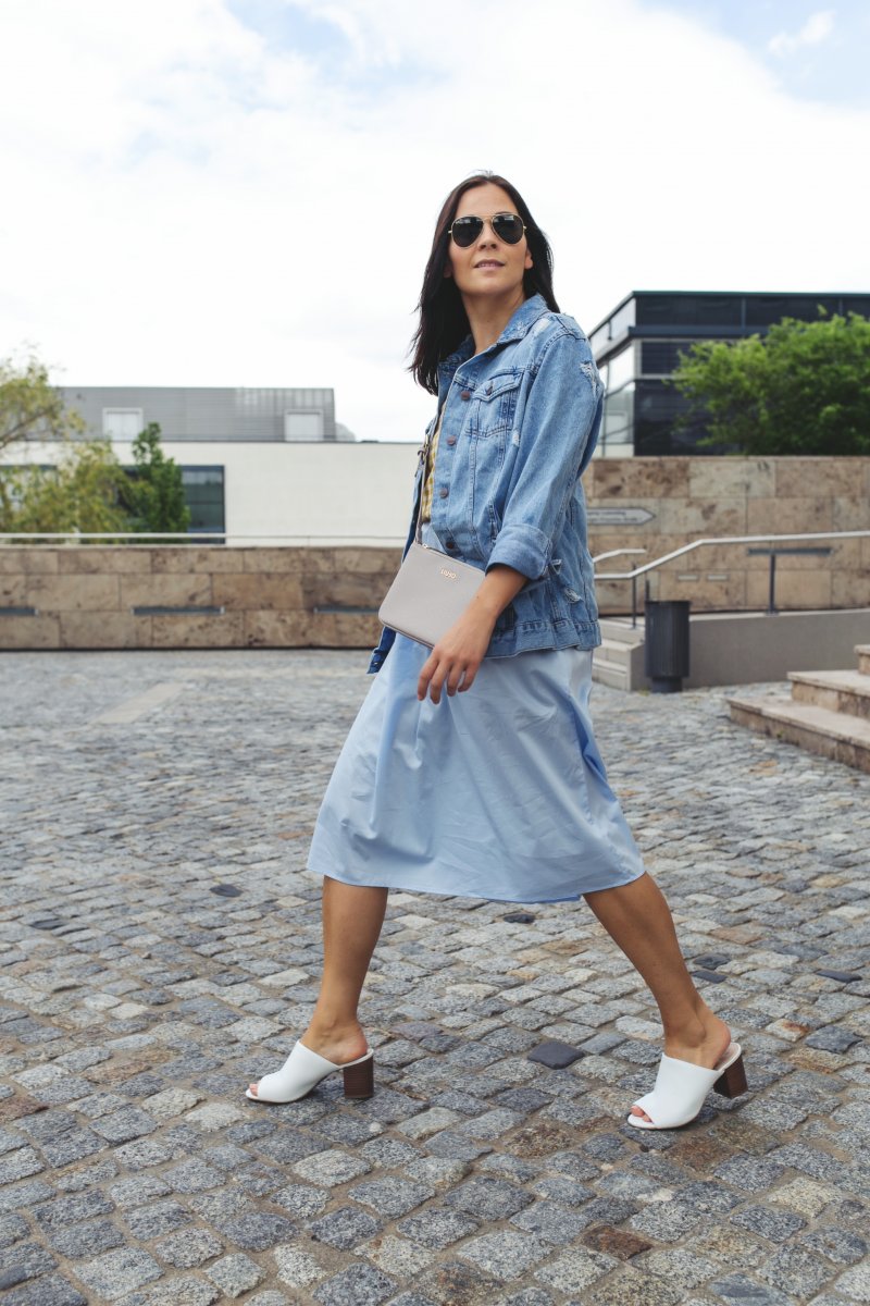 Im Alltag trage ich sehr selten hohe Schuhe. Hier setze ich gerne auf flache Sandalen und sportliche Sneakers. Aber es gibt diese gewissen hohen Schuhe, für die ich eine Ausnahme mache, weil sie einfach verdammt bequem sind. Wenn ihr gerne hohe Schuhe im Alltag tragt, dann solltet ihr unbedingt auf breite Absätze setzten. Ich liebe Blockabsätze über alles, denn sie ermöglichen, trotz Höhe einen hohen Tragekonfort am Fuß. Genau so einen Schuh habe ich heute zu dem Sommer Outfit mit Oversize Jeansjacke kombiniert. Die weißen Mules sind superbequem und sieht einfach sehr elegant zu meinem Outfit aus. Vor allem zu Sommer Outfits mit längeren Kleidern oder Midiröcken kann so ein Schuh einen gekonnten Abschluss am Fuß bilden. Wenn ich hohe Schuhe im Alltag tragen, dann eigentlich immer diejenigen mit breitem Blockabsatz.
