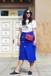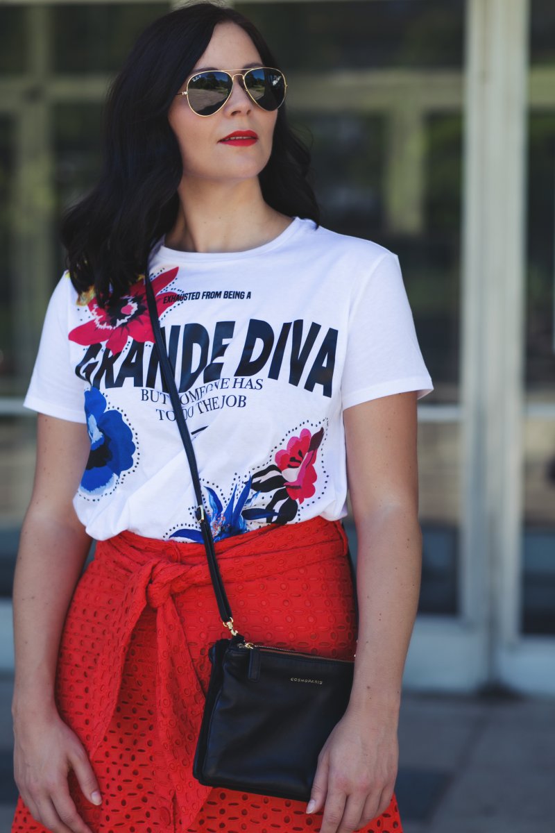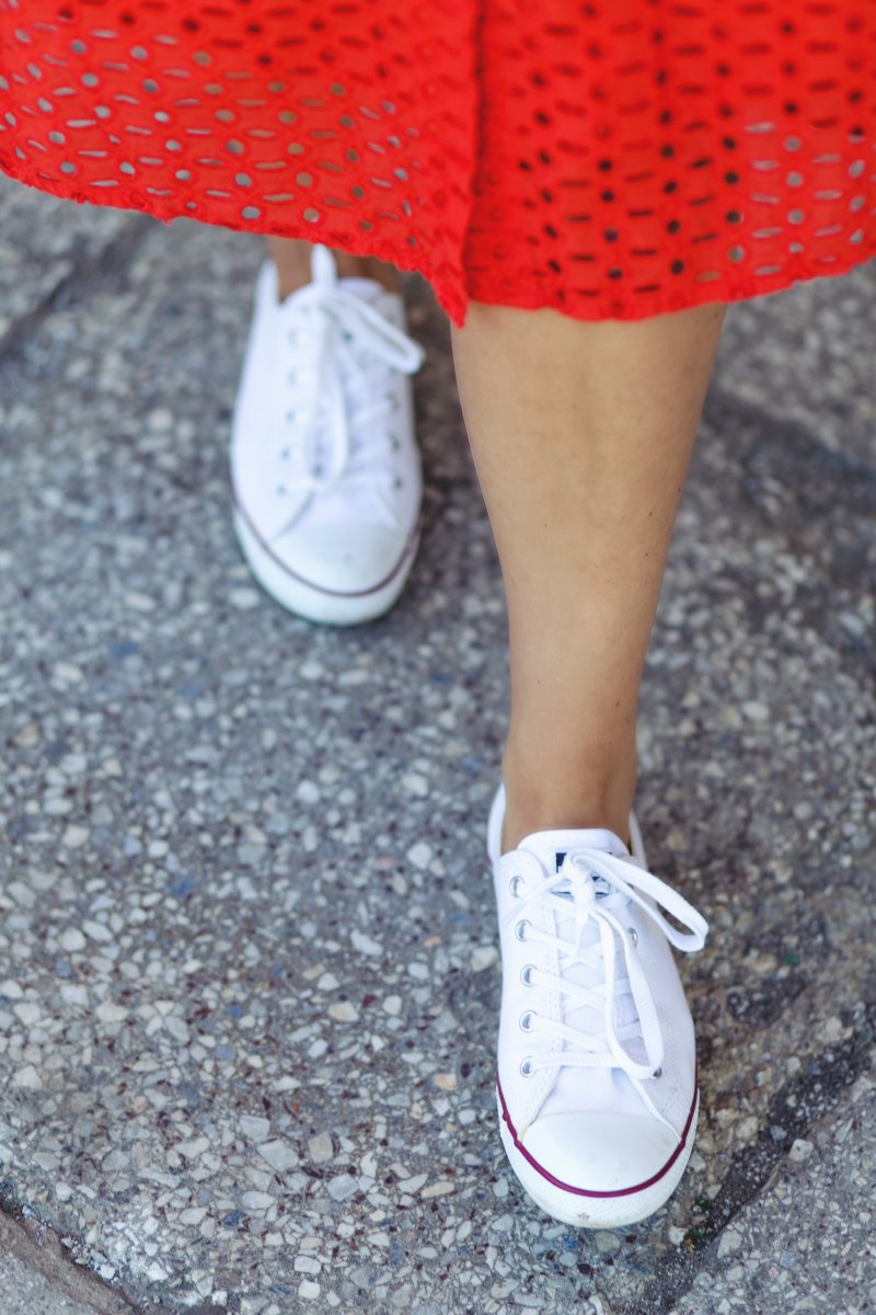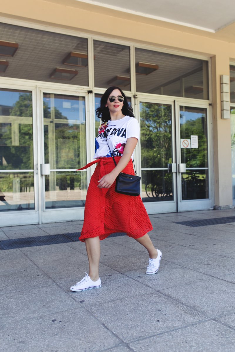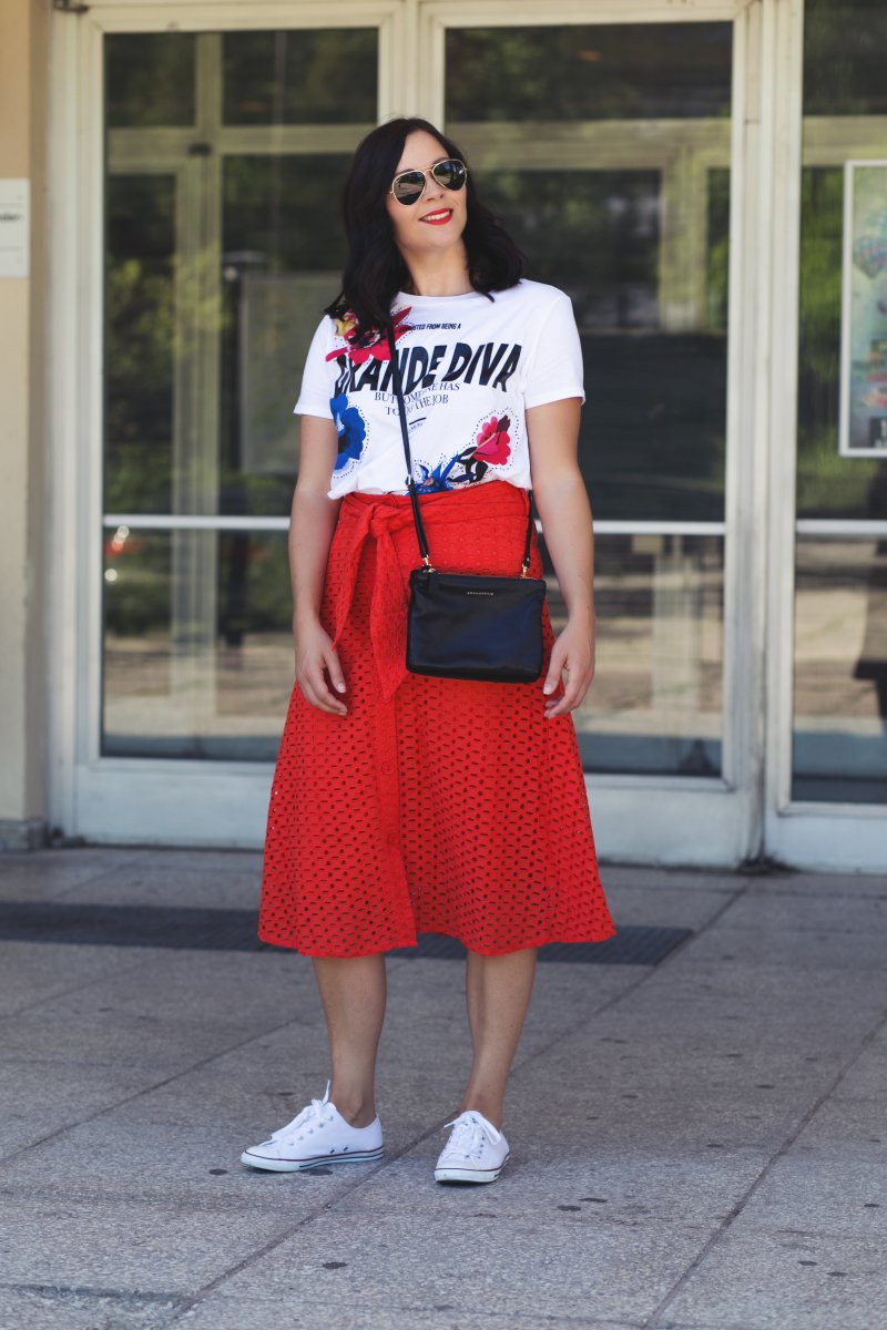 In meinem heutigen Sommeroutfit kombiniere ich zu den sportlichen Chucks einen roten Midirock mit Lochmuster. In diesem Rock habe ich mich sofort verliebt, als ich ihn gesehen habe. Der Rock harmoniert auf eine schöne Weise mit den Chucks, denn er greift das Rot in den Stoffschuhen noch einmal auf. Apropos Aufgreifen, da wären wir schon bei einem nächsten Must-have für diesen Sommer, dem Printshirt. Gefunden habe ich das farbenfrohe Shirt mit Statementdruck bei Zara. Das Shirt verleiht den ganzen Style noch mehr Farbe und Leichtigkeit. Vor allem der farbenfrohe Druck macht das Outfit zu etwas Besonderen.