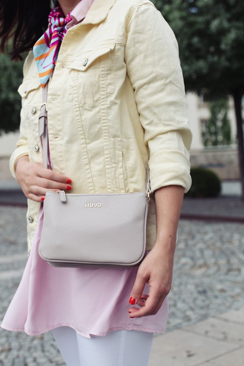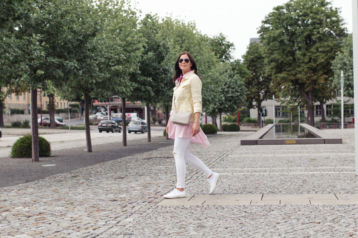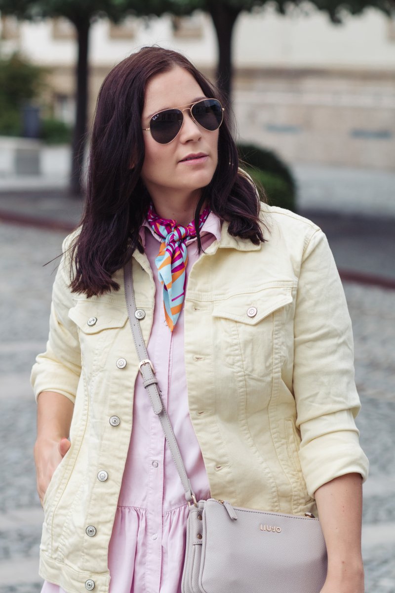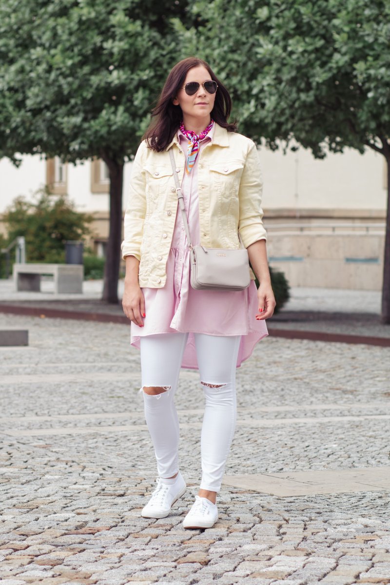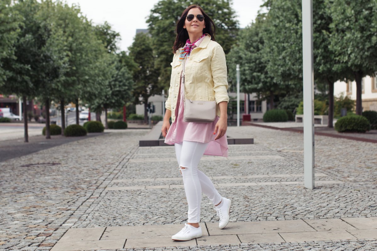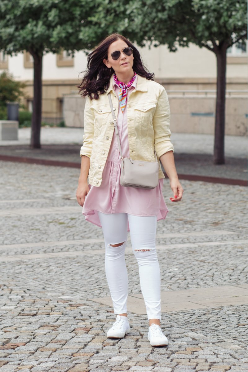 In meinem heutigen Outfit habe ich mich für ein ausgefallenes Jeansjackenmodell entschieden und setzte auf eine gelbe Jeansjacke. Diese passt einfach so gut zu dem rosafarbenen Blusenkleid, das ich erst kürzlich bei Zara entdeckt habe. Zu dem farblichen Eyecatcher in diesem Look habe ich mich für eine weiße Jeans von Topshop entschieden. Diese harmonisiert bestens mit dem pastellfarbenen Outfit und rundet es super ab. Als kleines Highlight habe ich mir noch ein auffälliges Tuch um den Hals geschlungen. Denn ganz auf Muster kann ich im Sommer einfach nicht verzichten.