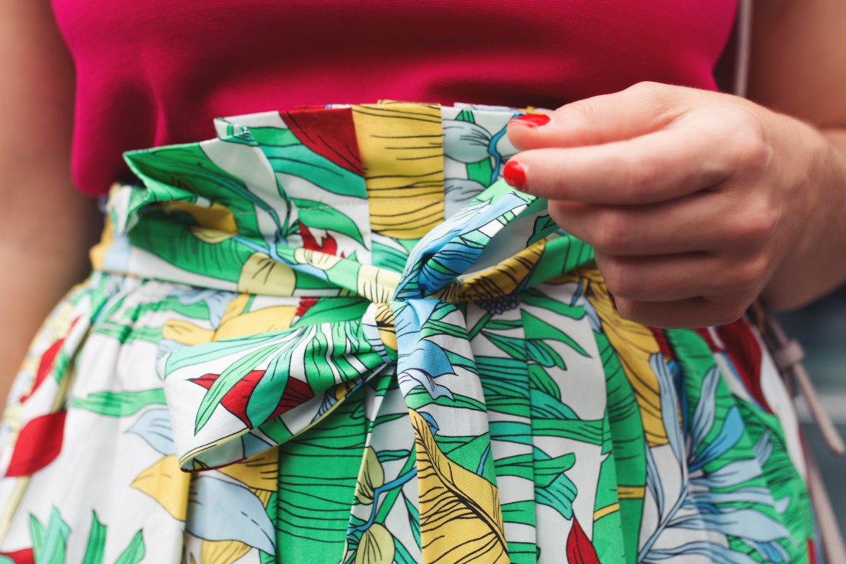 Der Midirock mit grafischem Tropenprint hat aber noch mehr zu bieten, als nur sein gutes Aussehen. Er überzeugt mich in erster Linie wegen seiner Bequemlichkeit. Vor allem an heißen Tage ist mir wichtig, dass ich zu Kleidungsstücken greife, in denen ich mich wohlfühle. Ein wesentlicher Aspekt dabei ist die Wahl des richtigen Stoffs. Im Sommer setze ich sehr gerne auf Baumwollestoffe, wie auch bei diesem Rock. Der Stoff ist sehr angenehm auf der Haut zu tragen, auch wenn es mal über 30 Grad werden – mit diesem Rock kommt ihr nicht so leicht ins Schwitzen.