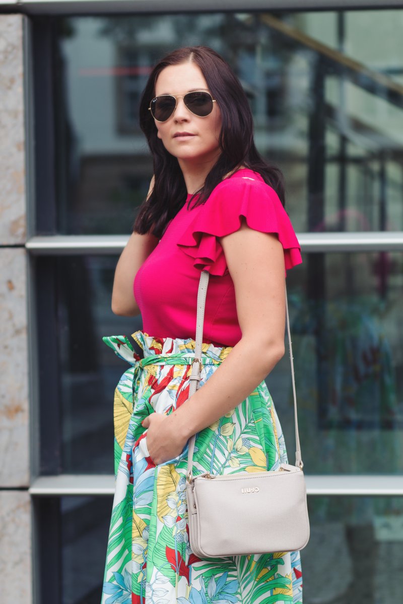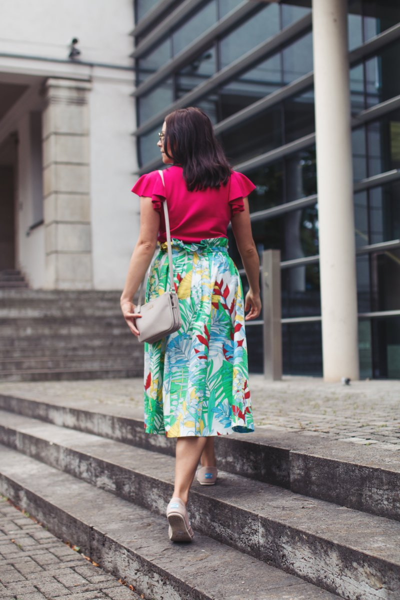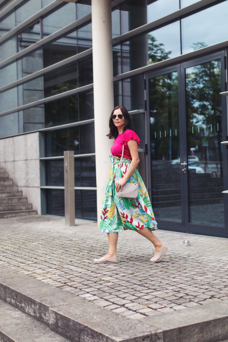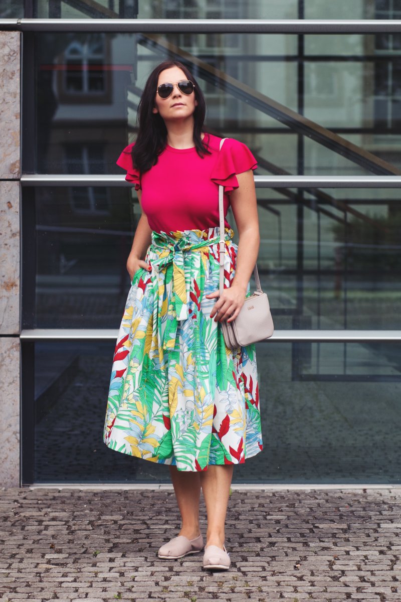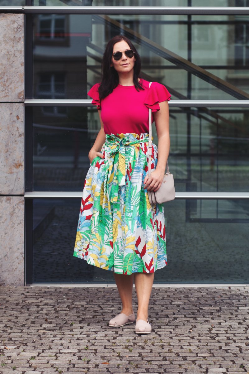 Auf auffällige Prints kann ich diesen Sommer nicht verzichten. Vor allem Midiröcke mit ausgefallenen Mustern haben es mir angetan. Eines meiner Sommer Must-have Outfits mit knalligem Midirock möchte ich euch heute vorstellen. Der Fashionstar dieses Looks ist definitiv der Midirock mit Tropenprint. Wo ich diesen Rock gefunden habe und warum er so bequem ist, verrate ich euch jetzt auf meinem Modeblog.