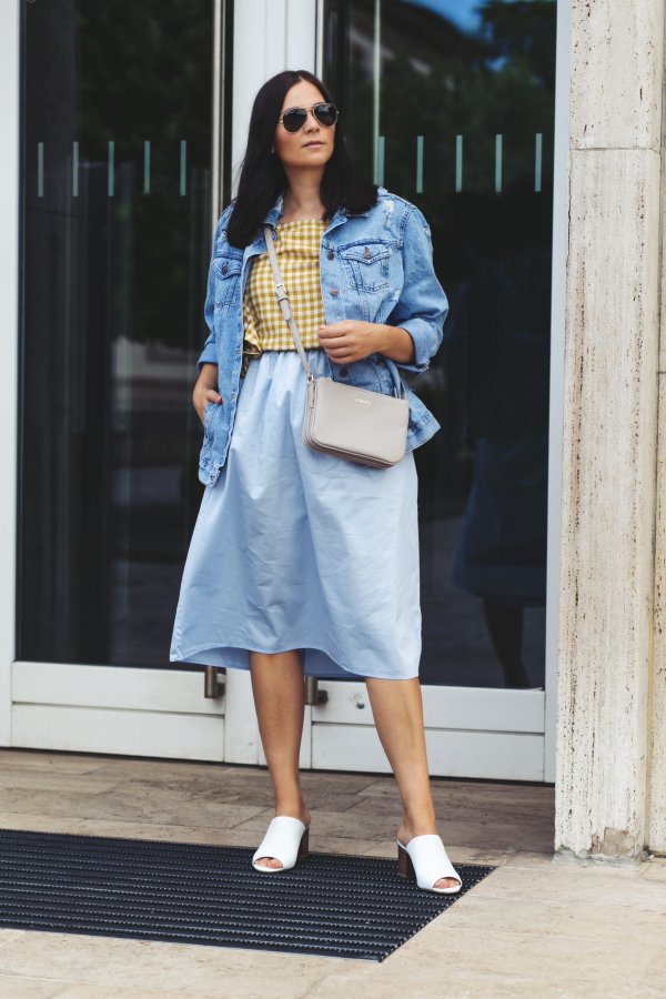 - Sommer Outfit mit Oversize Jeansjacke, Midirock und karierter Bluse