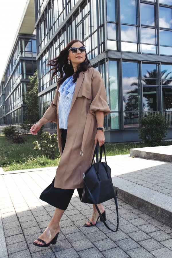 - Trenchcoat Sommer Outfit mit Culotte, Oneshoulder Top und Stella McCartney Sonnenbrille