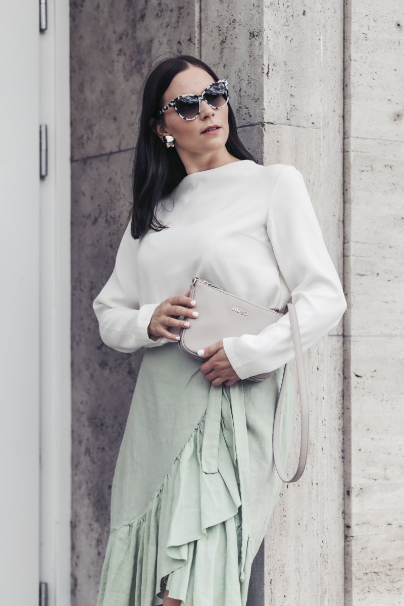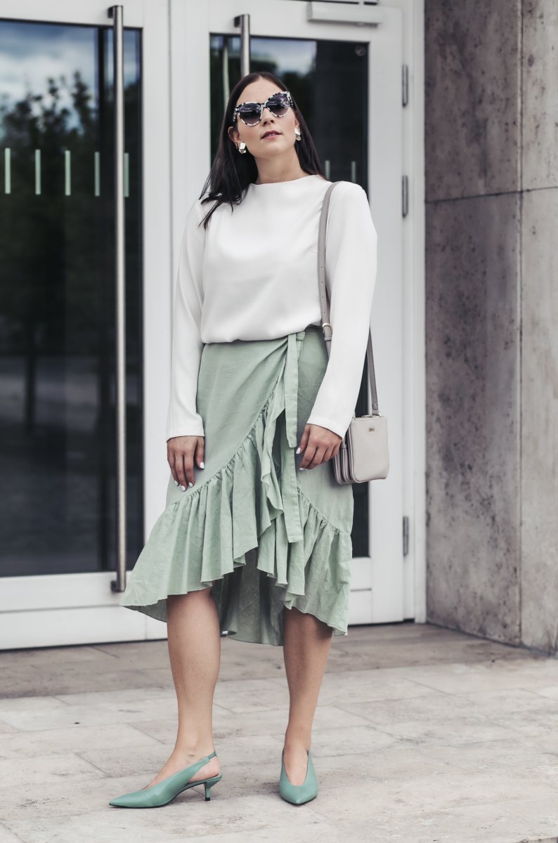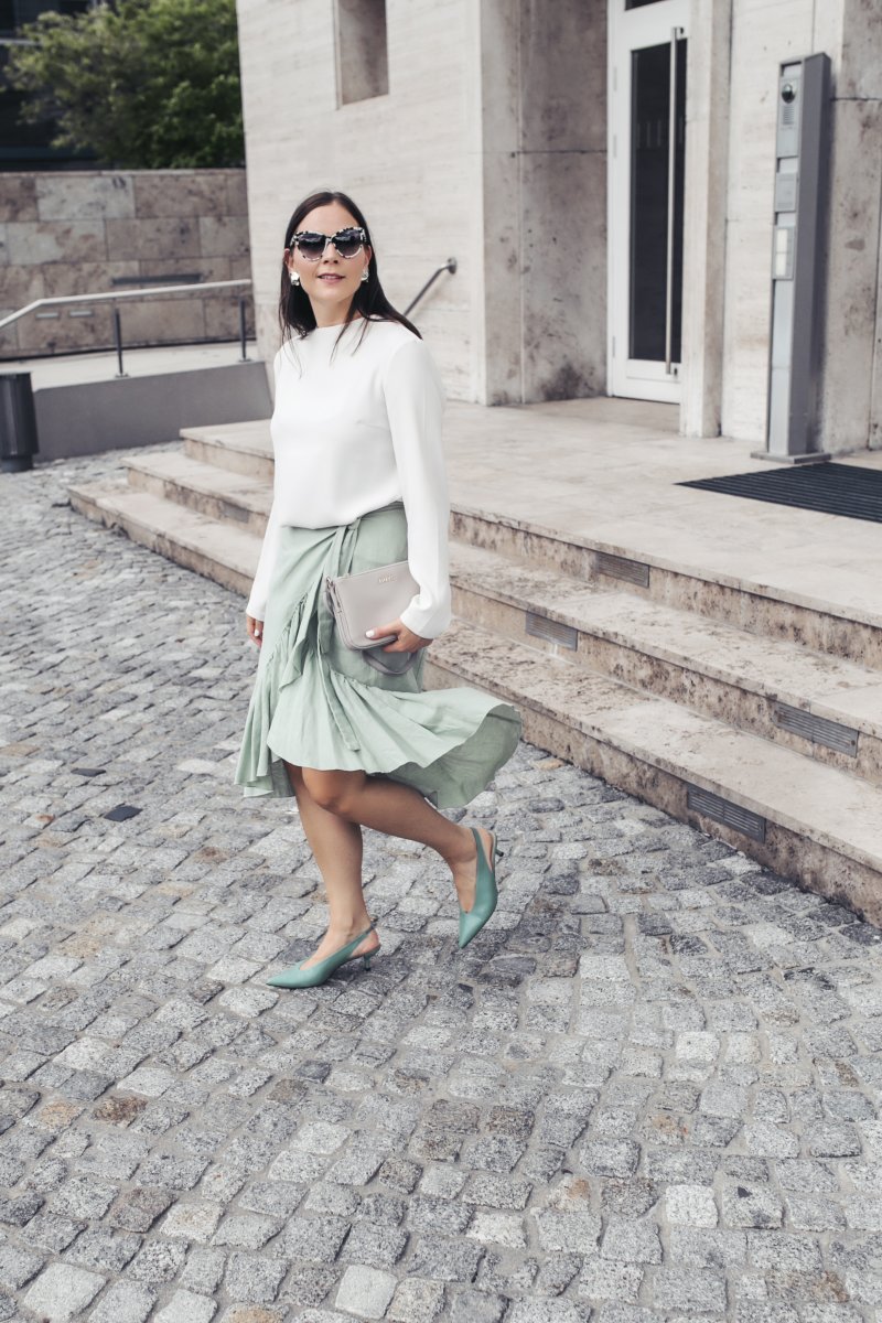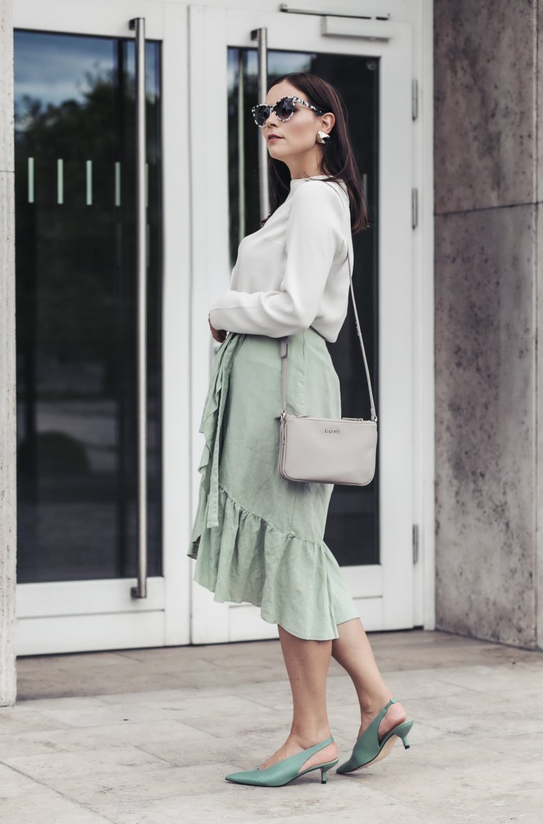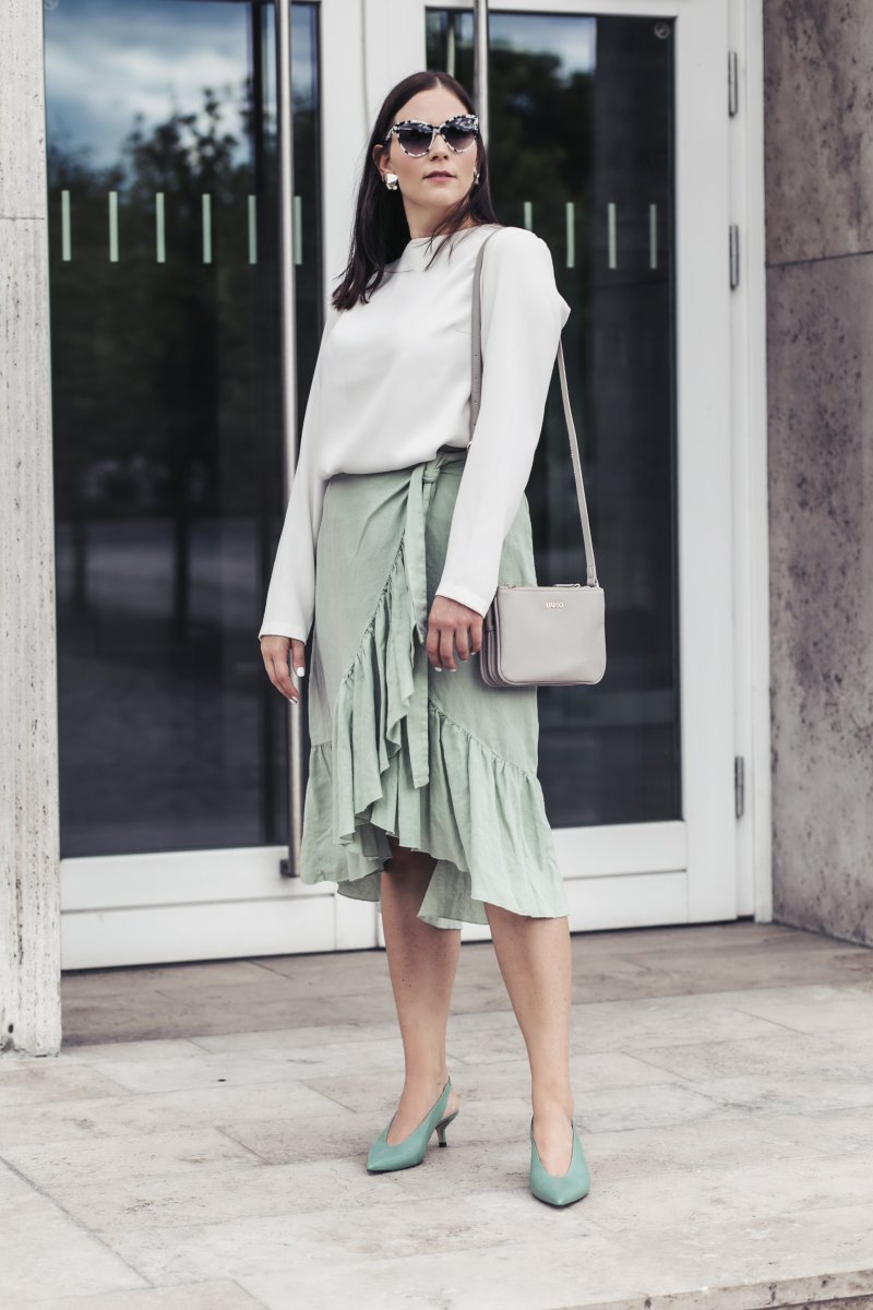 In meinem heutigen Spätsommer Outfit kombiniere ich den Wickelrock auf eine klassisch-elegante Weise. Ich trage zu dem gerüschten Modell in Mintgrün, ein weißes Oberteil von Selected Femme. Passend zu dem grünen Rock habe ich auch die Slingback-Pumps ausgewählt, die ebenfalls in einem Grünton gehalten sind. Wieder mit von der Partie ist meine Stella McCartney Sonnenbrille, die ihr schon in zahlreichen Sommer Outfits hier auf dem Modeblog bewundern konntet, ebenso wie die beige Tasche von Liu Jo, die durch ihre neutrale Farbgebung einfach zu jedem Outfit eine gute Figur macht. Sie wird mich noch in zahlreichen Herbst Outfits begleiten, soviel sei garantiert.