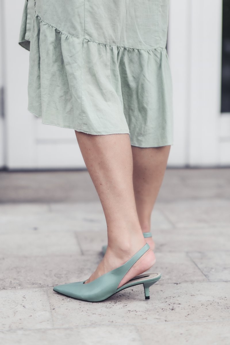 Spätsommer Outfit mit grünem Wickelrock und Slingback-Pumps