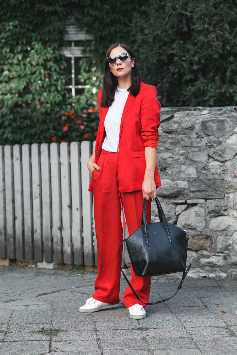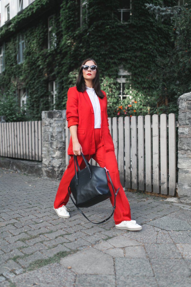 Wow! So ein Ton-in-Ton Look in Rot finde ich einfach nur Mega! Eine schöne Kombination und durch die Farbe allein wirkt. Die Farbe steht dir zudem auch sehr gut. Ich sollte mir überlegen, ob ich nicht auch mal nach so einem Hosenanzug Ausschau halte.
