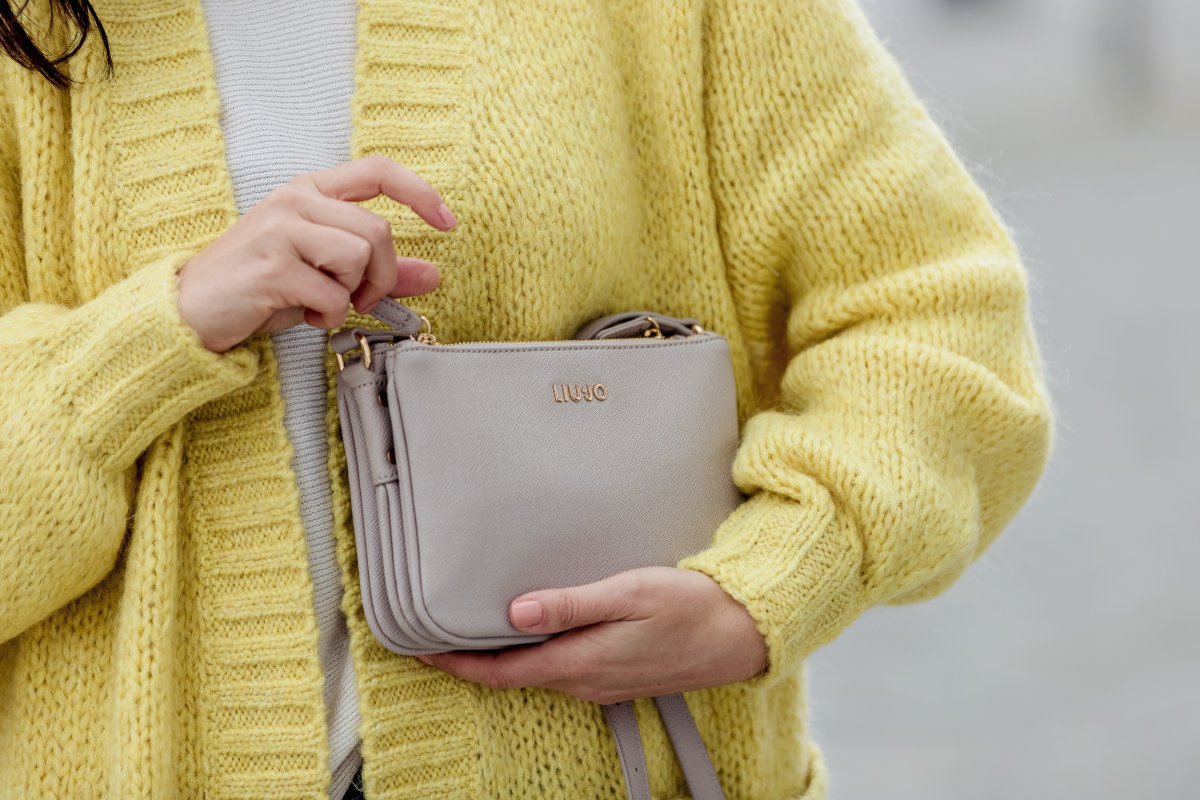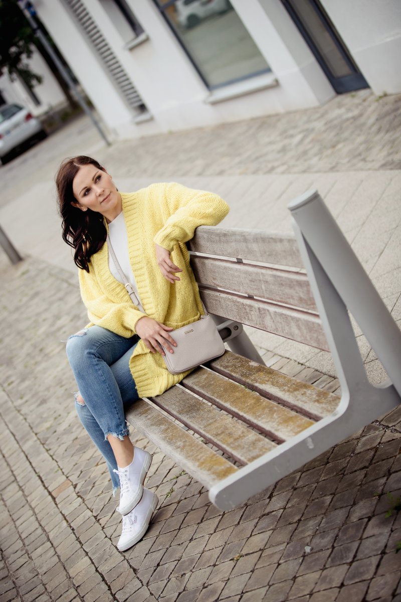 Zu dem gelben Cardigan habe ich eine Destroyed Jeans und weißen Pullover kombiniert. An den Füßen trage ich weiße Sneakers, die sich ganz harmonisch in das Gesamtbild einfügen. Ebenso wie die kleine Tasche, die ihr schon aus vielen meinen Outfits hier auf dem Modeblog kennt.