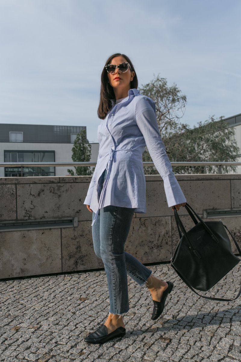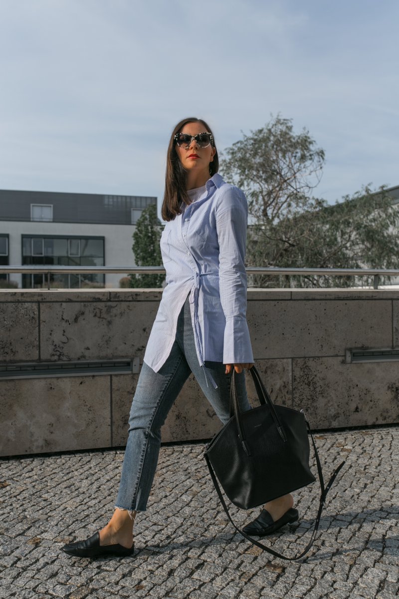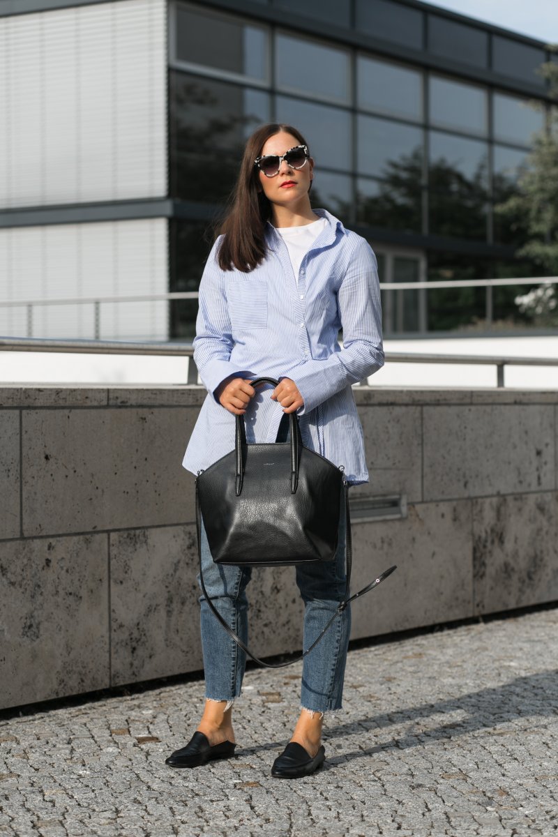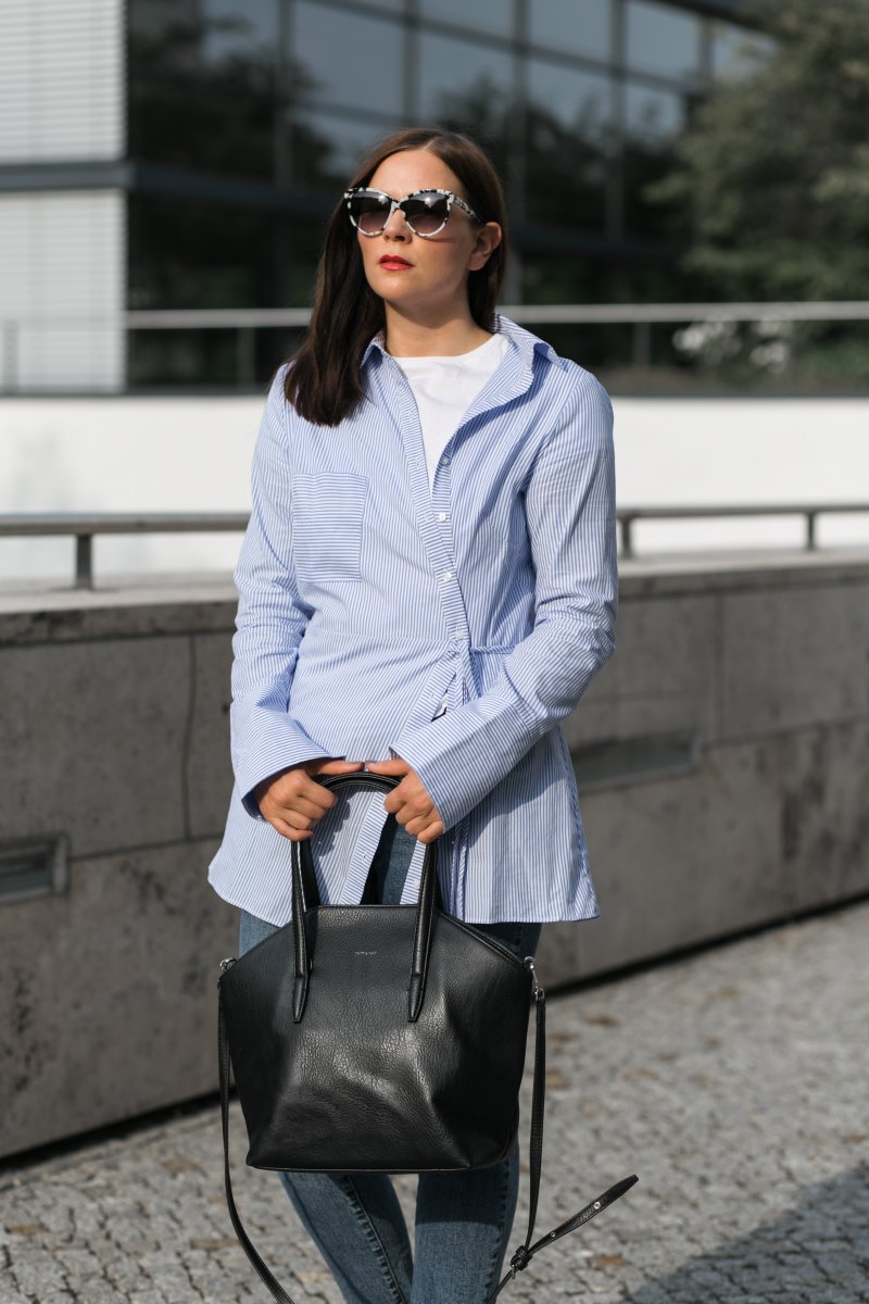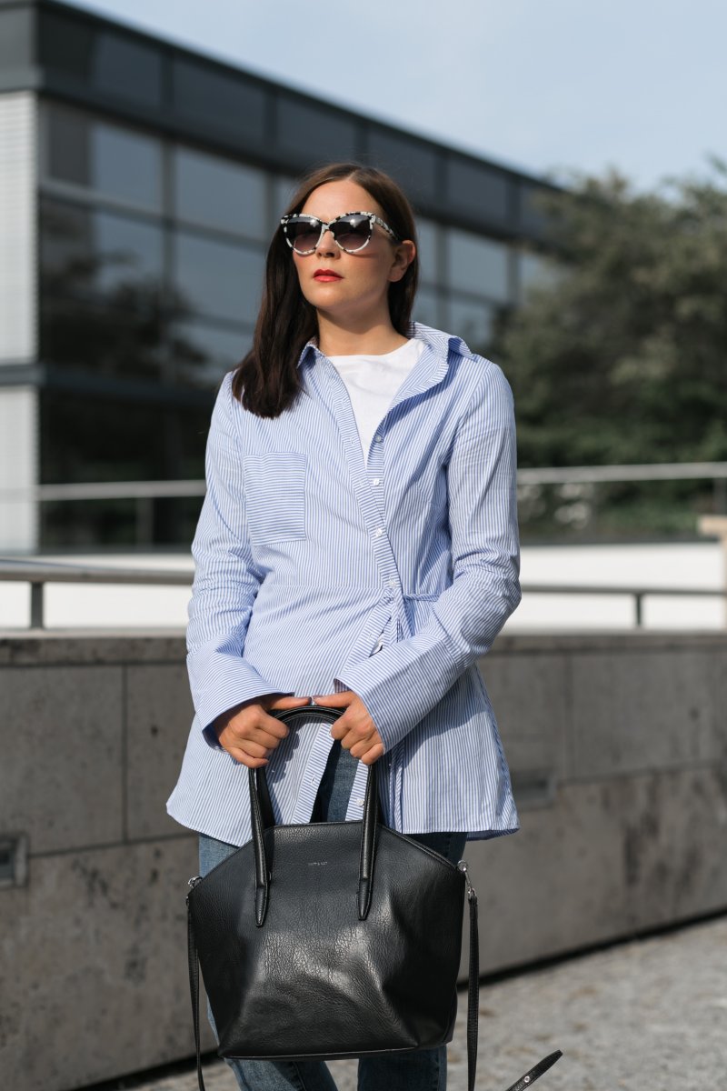 Wenn ich zwei Dinge im Herbst nicht missen möchte, sind das Mom Jeans und Streifenbluse. Beides habe ich in mehrfacher Ausführung im Schrank und kommt regelmäßig im Herbst zum Einsatz. Genauso eine Kombination möchte ich euch heute vorstellen. Ich trage eine Streifenbluse von H&M, die ich mir einem Basic Shirt von Asos kombiniert habe. Dazu style ich meine heiß geliebte Mom Jeans von Noisy May, die ihr schon in zahlreichen Outfits hier auf dem Modeblog bewundern konntet. Ebenfalls drei alte Bekannte sind die Matt & Nat Baxter Bag, meine schwarzen Slippers von Flattered und die Stella McCartney Sonnenbrille.