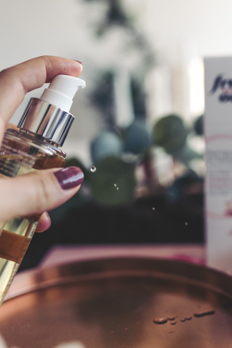 Bevor das Öl aufgetragen werden kann, reinige ich mein Gesicht wie üblich und befreie es von Schmutz. Anschließend gebe ich 4-5 Pumpstöße des Produkts in die Handflächen und massiere es mit sanften Bewegungen in mein Gesicht ein. Das Öl lasse ich dann für 5-10 Minuten auf meinem Gesicht, dass es richtig gut von der Haut aufgenommen werden kann. Anschließend spüle ich mein Gesicht mit lauwarmem Wasser ab. Meine Haut fühlt sich danach samtweich an und sehr gut gepflegt.