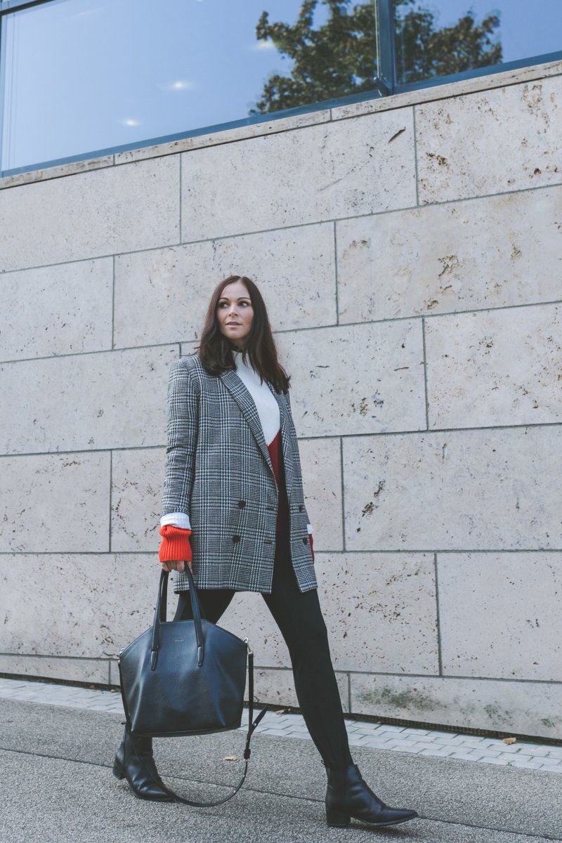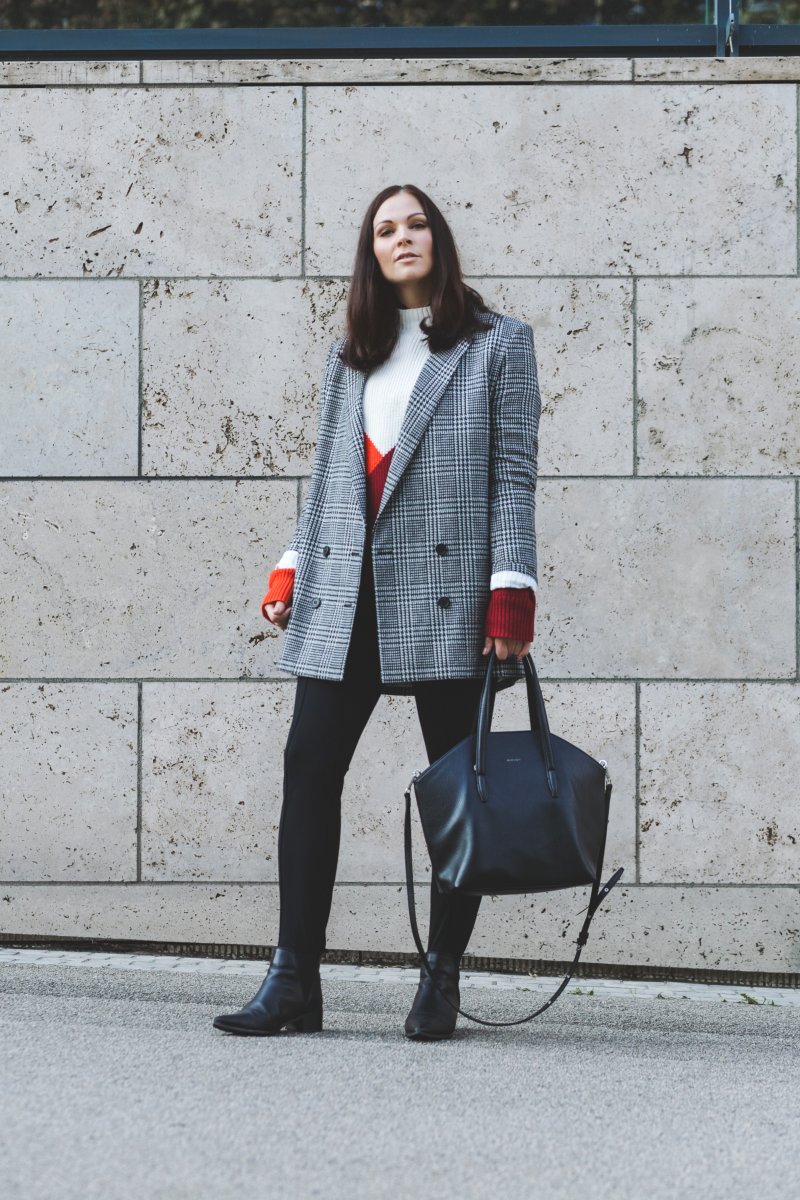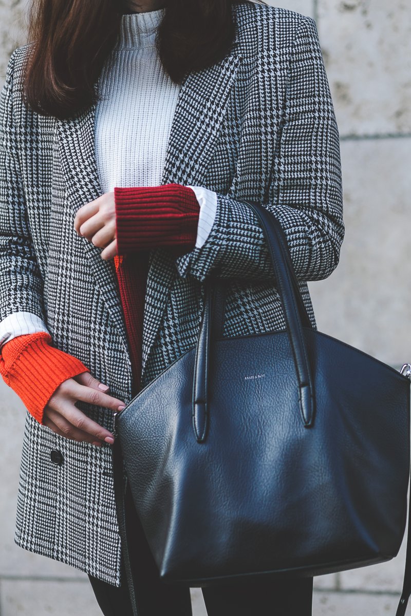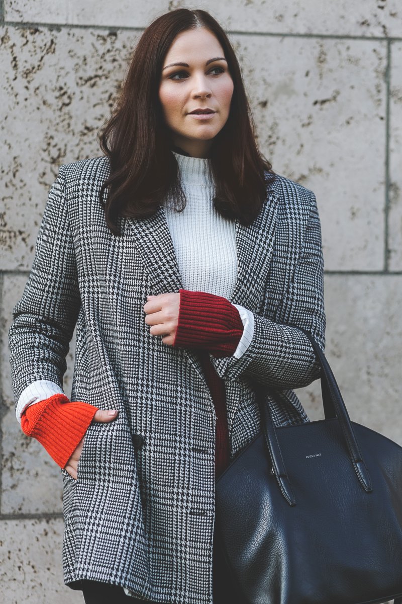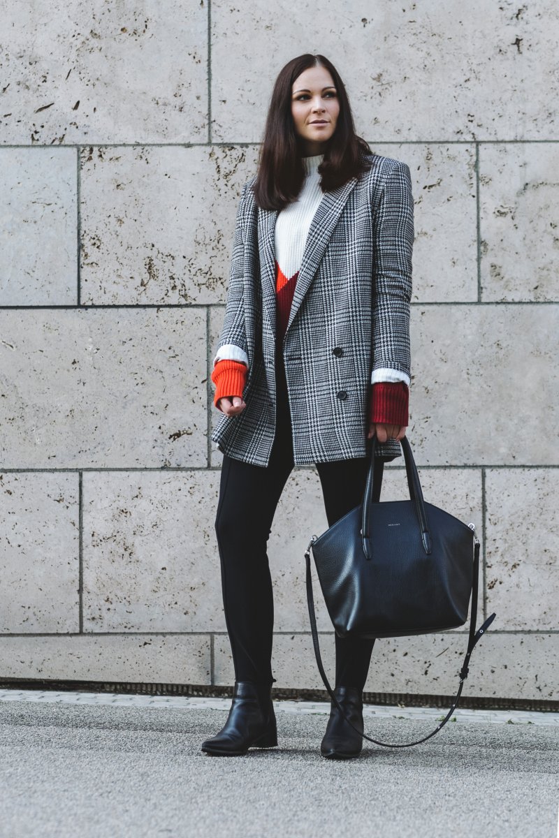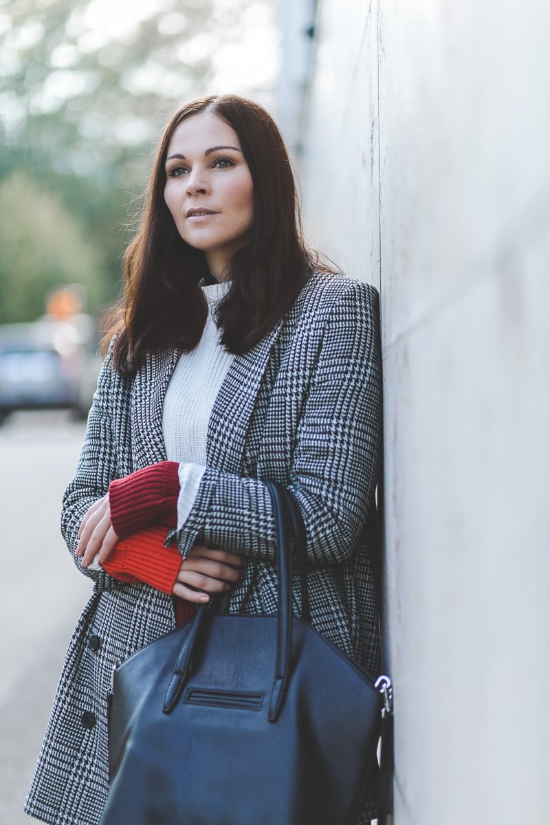 Ich kombiniere gerne unterschiedliche Muster zueinander, auch in meinem heutigen Outfit hat es so ein Mustermix geschafft. Zu dem auffälligen Karomuster kombiniere ich einen Pullover mit zickzack Streifen in Weiß und unterschiedlichen Rotnuancen. Dazu trage ich meine geliebten Basics, die auf dem Fashion Blog schon lange präsent sind. Zum einen die schwarze Jeans von Topshop, meine Boots von Bianco und die schwarze Tasche von Matt & Nat. Drei Klassiker, die sich mit jedem auch so ausgefallenen Teil kombinieren lassen und es gekonnt abrunden.