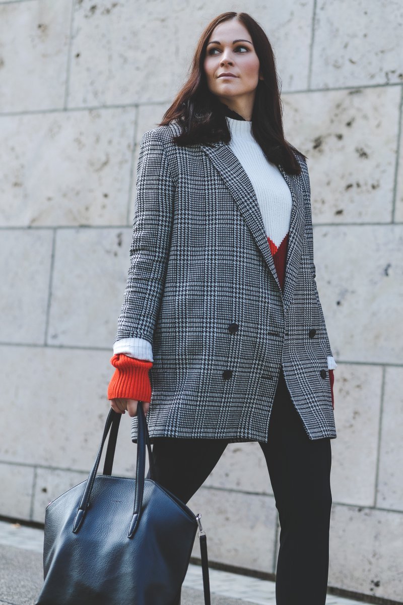 Herbst Outfit mit kariertem Blazer und Strickpullover