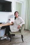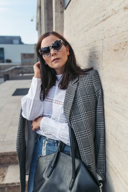 - Herbst Outfit mit kariertem Blazer, weißer Bluse und lila Boots