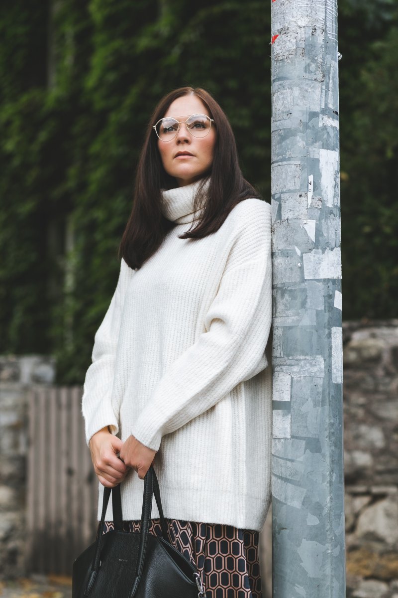 Herbst Outfit mit Strickpullover und eleganten Wickelrock kombinieren