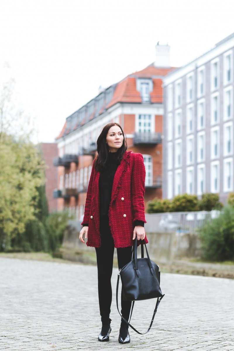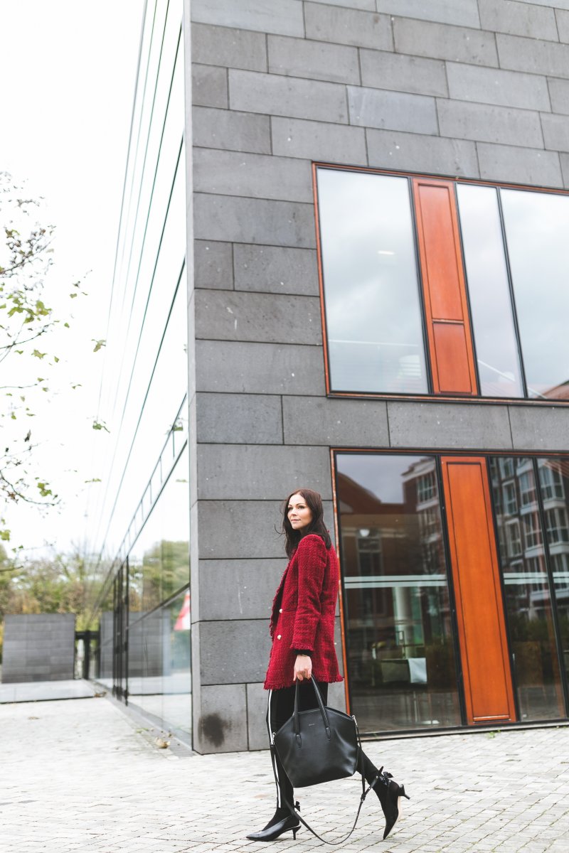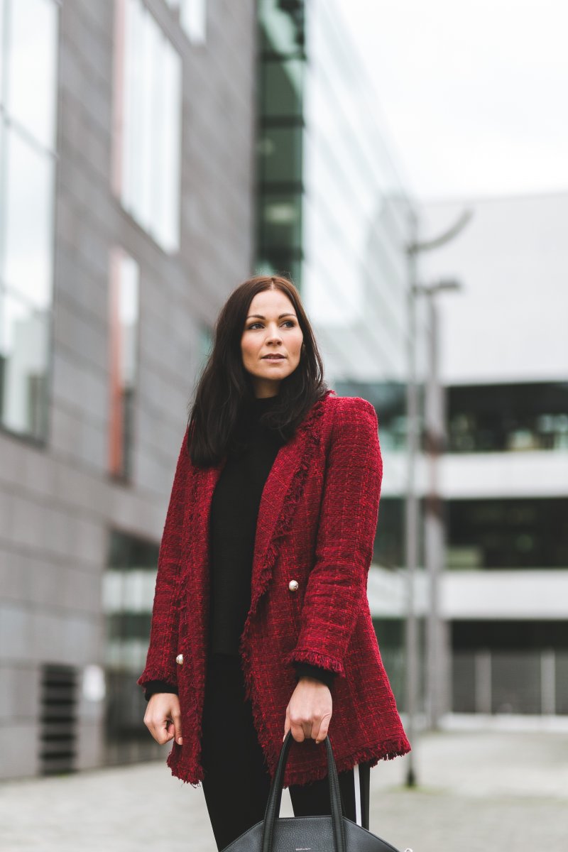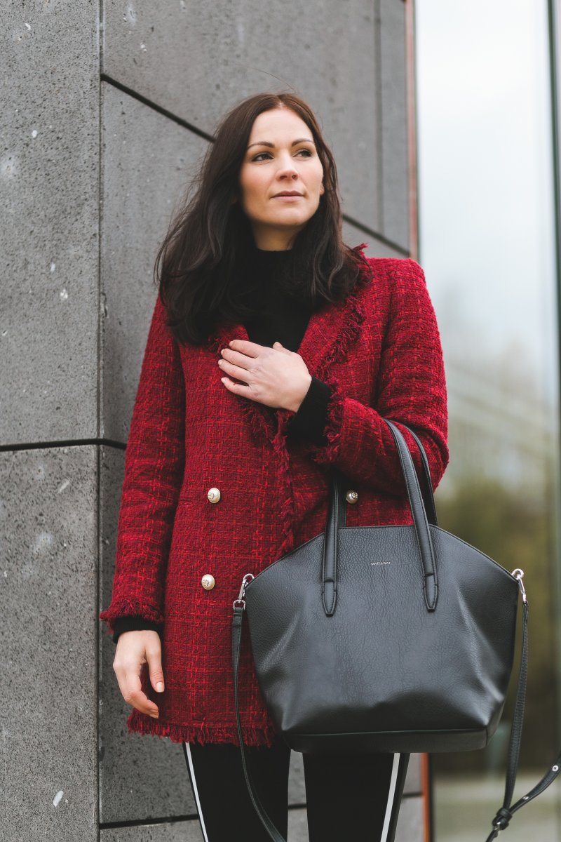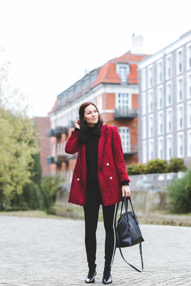Im Alltag trage ich gerne eine Stilmischung aus sportlich und elegant aus. So auch in meinem heutigen Outfit. Ich kombiniere zu einem eleganten Tweedblazer eine sportliche Hose mit Streifendetails an der Seite. Für mich ist das derzeit die perfekte Kombination, was sportlich und schick betrifft.