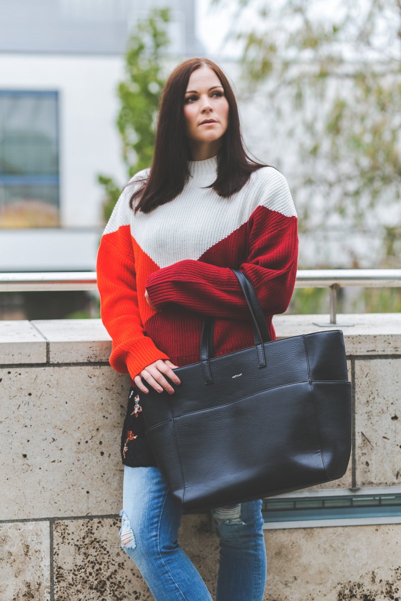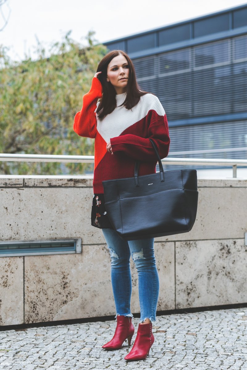 Dazu kombiniere ich auffällige rote Boots, die den Look nicht nur zum absoluten Highlight werden lassen, sondern auch noch super bequem sind. Aber auch auf die Klassiker möchte ich in meinem Outfit nicht verzichten. Neben der schwarzen Tasche von Matt & Nat greife ich zur blauen Jeans – zwei absolute Basics in meinem Kleiderschrank.