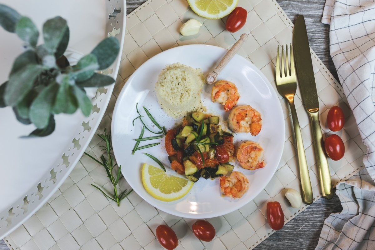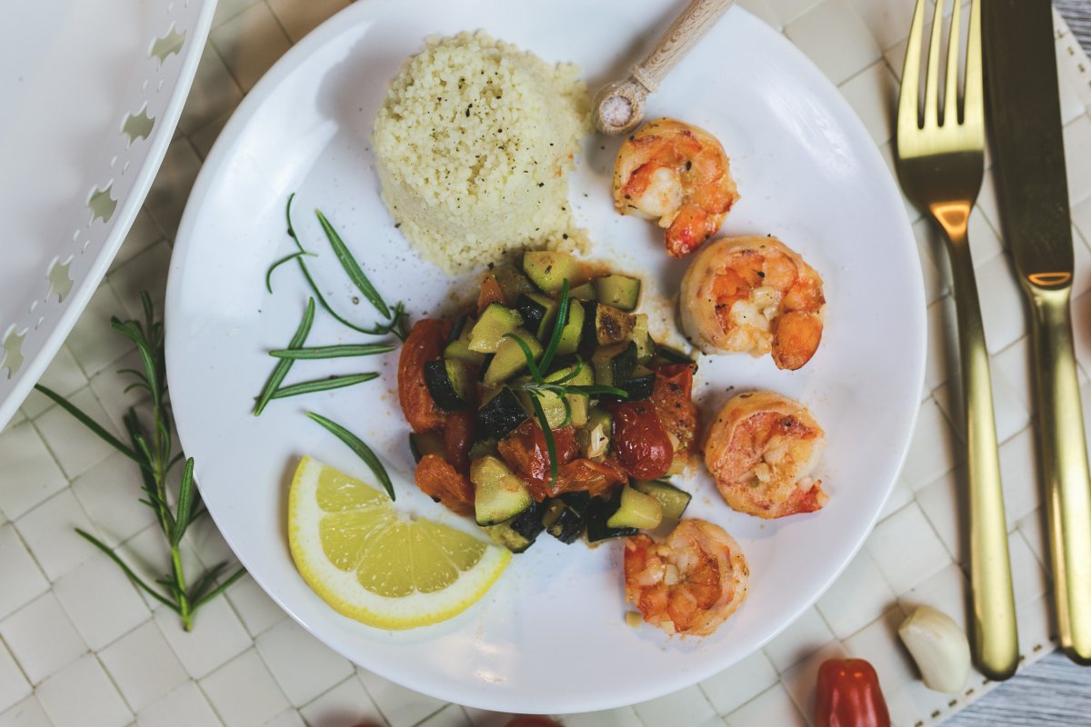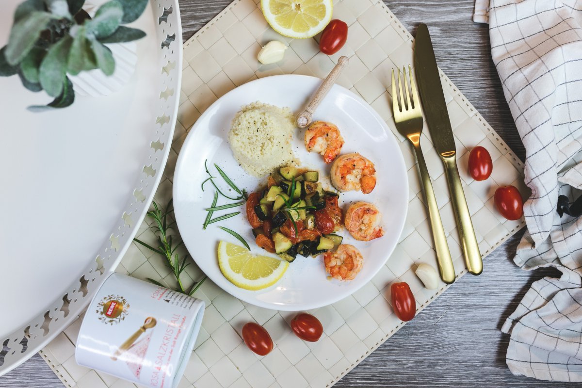 - Garnelengemüsepfanne mit den Couscous zusammen servieren.