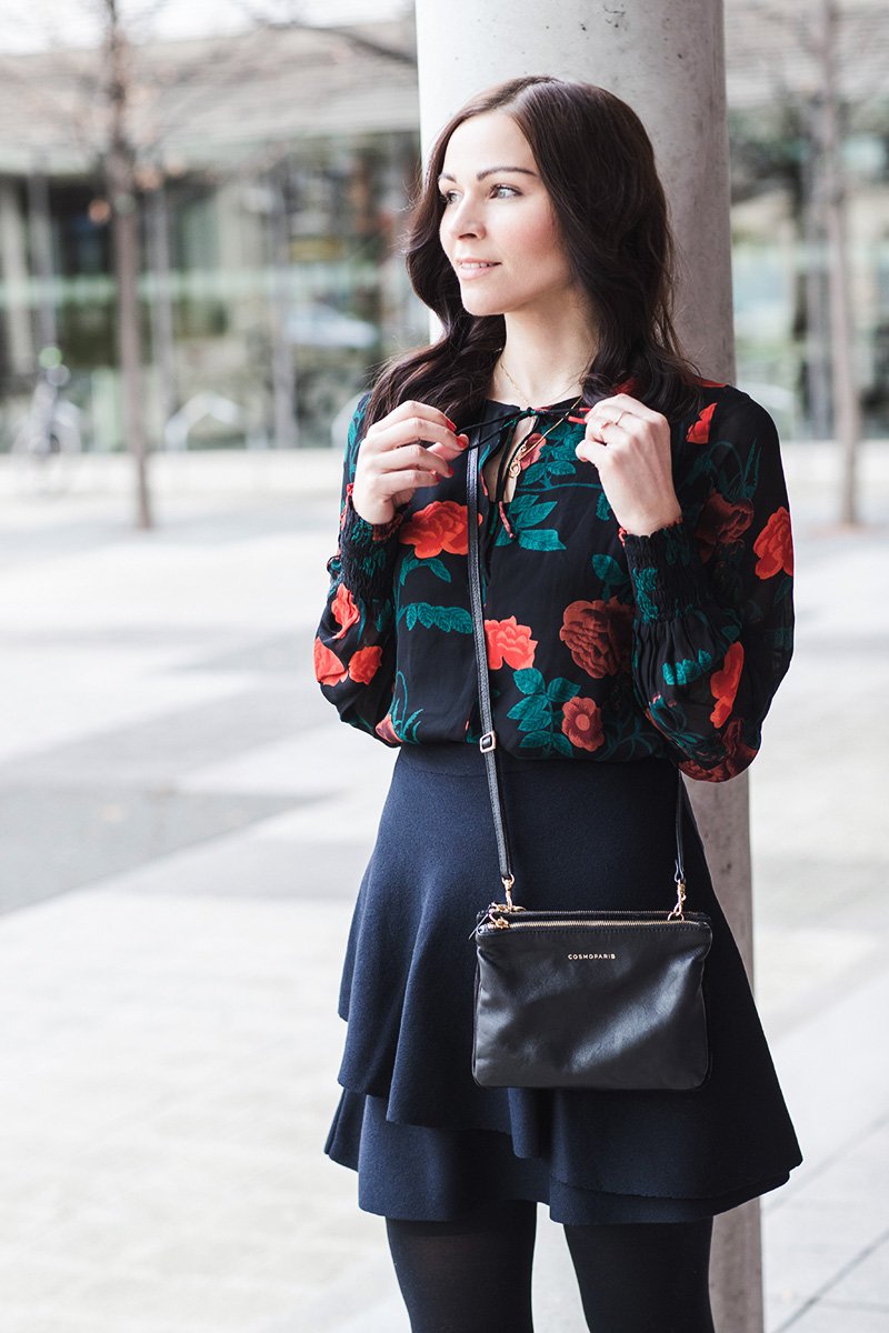 In meinem heutigen Style kombiniere ich eine auffällige Bluse von Ganni zu einem schlichten schwarzen Minirock. Der Rock wirkt durch seine überlappenden Volants einfach wie gemacht für einen festlichen Anlass und macht ebenso zu T-Shirt eine gute Figur. Kombiniert habe ich die beiden Teile zu schwarzen Sock-Boots, die diesen Winter der letzte Schrei in der Fashionwelt sind. Die bequemen Schuhe sitzen wie eine zweite Haut am Fuß und sehen durch die abgesetzten lackspitzen einfach umwerfend aus.