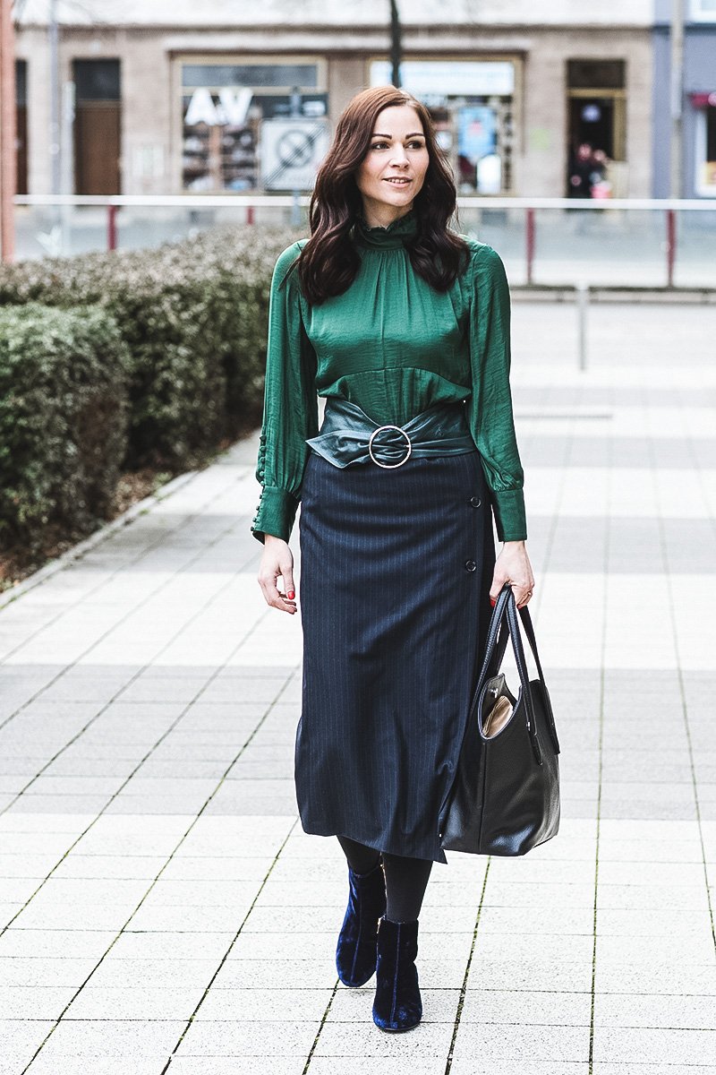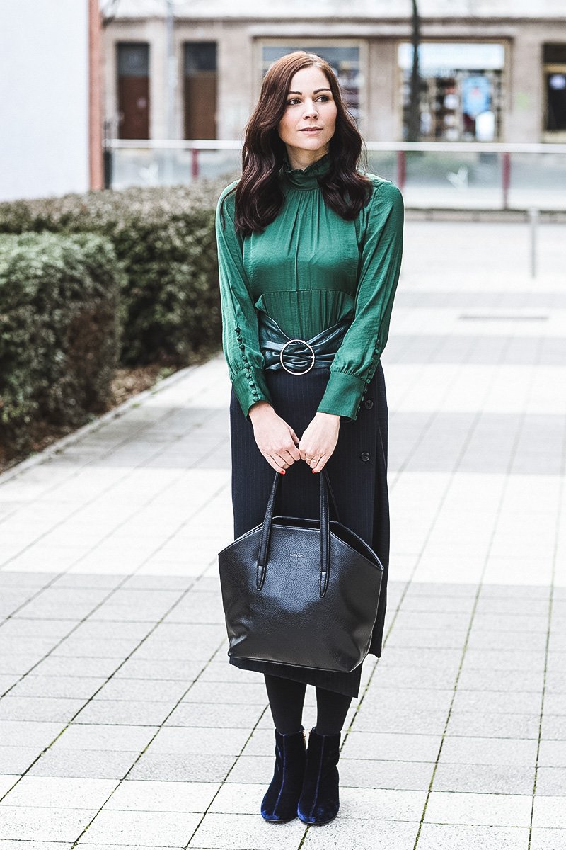 Grün und Blau in Kombination sind zwei Farben, die ich diesen Winter nicht in meinem Kleiderschrank missen möchte. Ein Winter Outfit mit genau diesen zwei kühlen Farbtönen habe ich heute für euch parat. Ich präsentiere euch einen Look mit gestreiften Midirock, Blusenkleid und & Other Stories Samt-Boots auf meinem Modeblog.