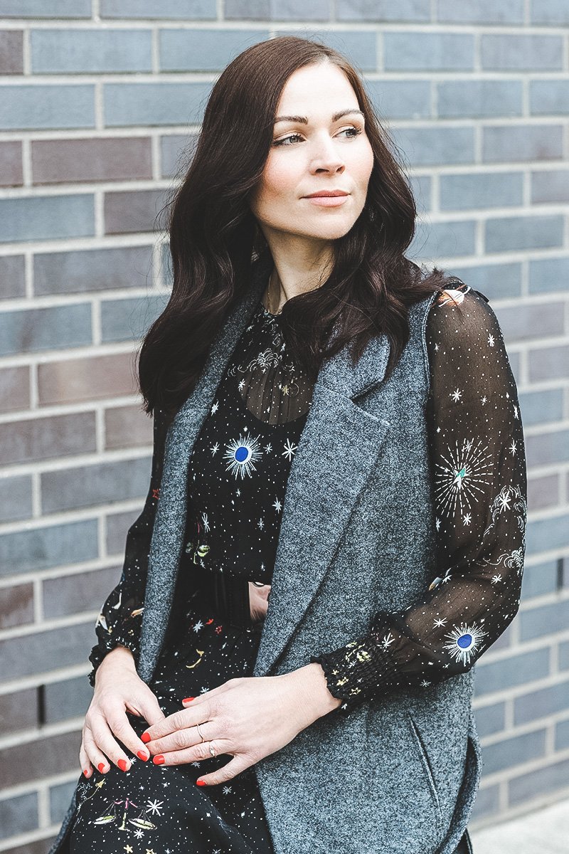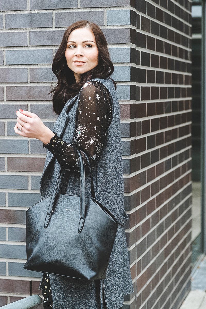 Der Fokus bei meinem heutigen Look liegt ganz klar auf dem schwarzen Kleid mit auffälligem Muster. Das kleine Sternenmuster hat mich sofort fasziniert – es peppt einfach jedes Outfit auf und lässt es interessant wirken. Für etwas Wärme sorgt die dicke Wollweste, die ihr schon aus dem letzten Winter kennt. Auch in dieser Saison ist sie im Alltag ein heißgeliebter Begleiter von mir geworden, der für zusätzliche Wärme sorgt.