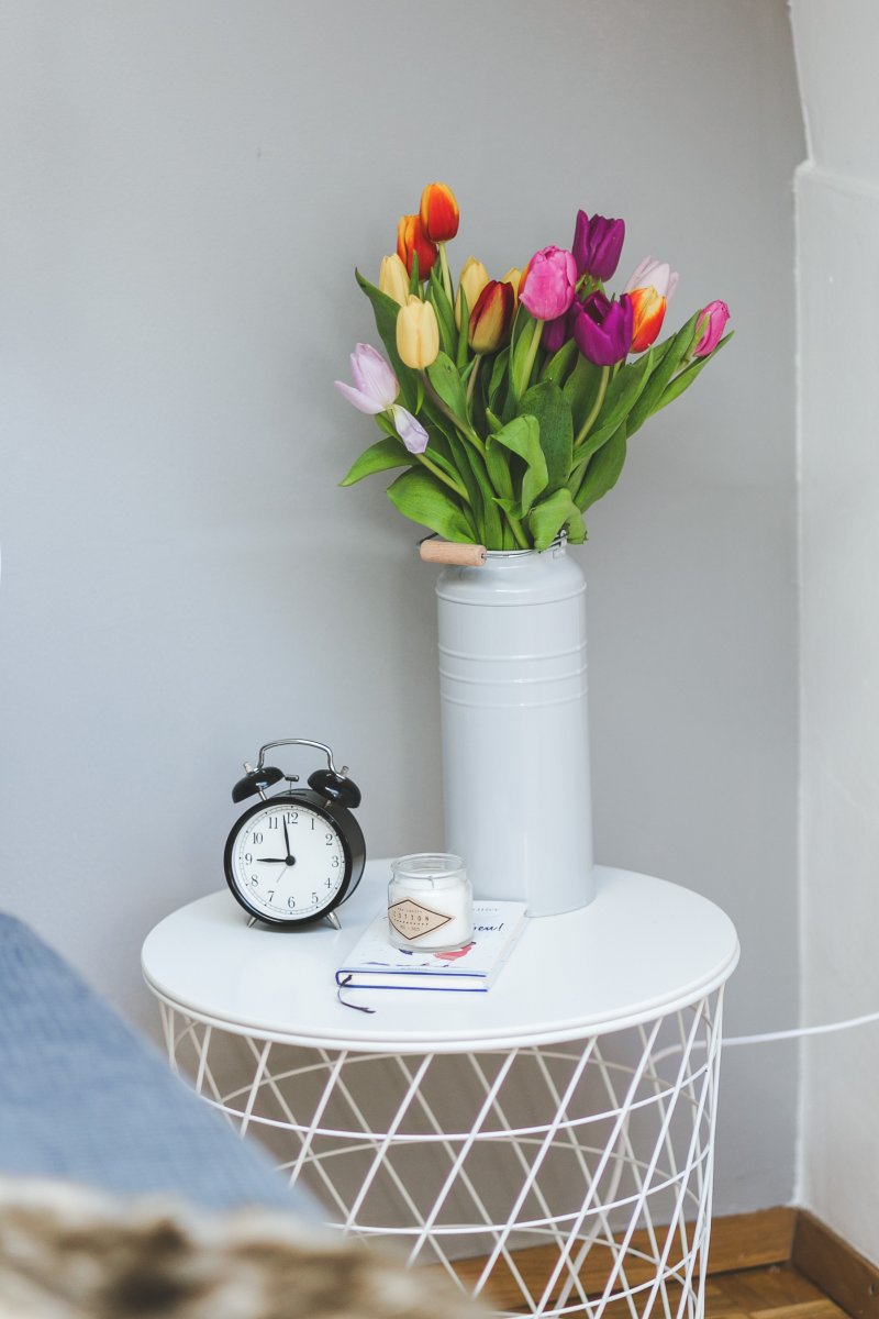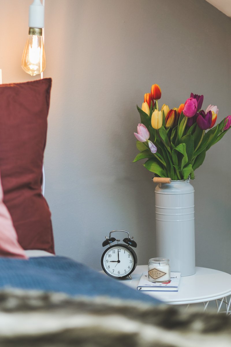 Gemütlichkeit schafft darüber hinaus, auch die richtige Beleuchtung. Ich habe mich für warme Leuchten entschieden, die genau die richtige Helligkeit haben, um ein gutes Buch zu verschlingen und dabei den Gemütlichkeitsfaktor nicht zu vernachlässigen. Ein Gefühl von zu Hause vermitteln mit auch immer frische Blumen. Jetzt wo es so allmählich auf den Frühling zugeht, stelle ich mir gerne frische Tulpen auf den Nachttisch. Wenn ich aufwache, habe ich gleich gute Laune und freue mich schon auf den bevorstehenden Frühling und natürlich Sommer.