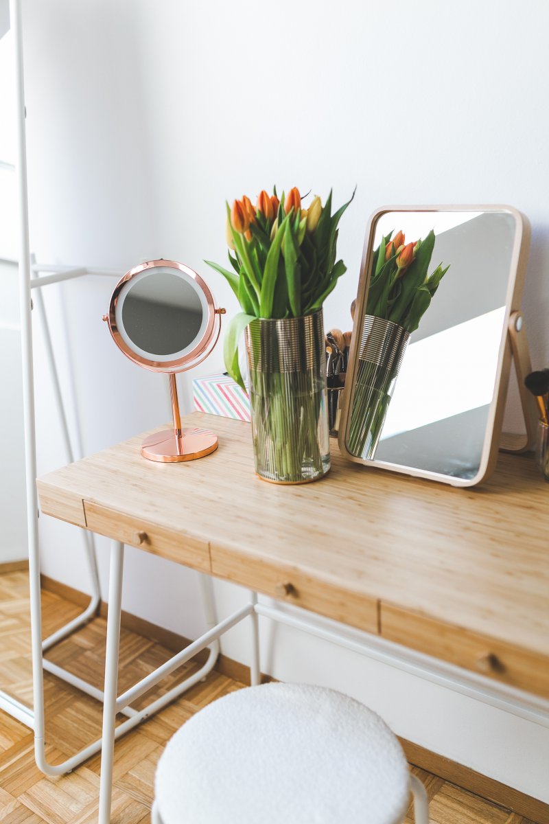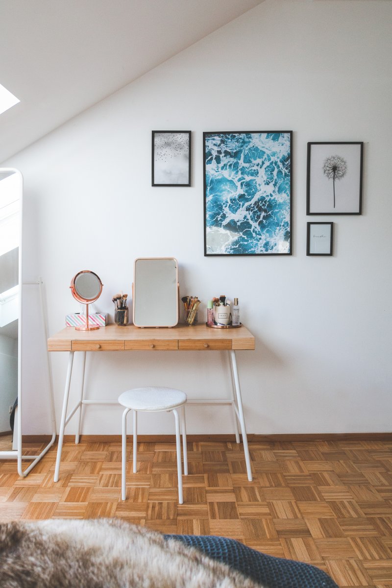 In meinem alten Schlafzimmer musste ich aus platztechnischen Gründen auf einen Schminktisch verzichten. Jetzt, in meinem neuen Heim habe ich mir diesen Wunsch erfüllt und eine kleine Schmink-Area im Schlafzimmer eingerichtet. Als Schminktisch habe ich mich für den IKEA Lillåsen Schreibtisch entschieden. Der Mix aus Metal und Holz hat mich sofort angesprochen und reiht sich sehr gut in das Farbkonzept meines Schlafzimmers ein. Auch die drei Schubladen, die der Schminktisch zu bieten hat, sind sehr praktisch. In ihnen ist jede Menge Platz für meine Schminkutensilien und sie sind dabei gut verstaut.